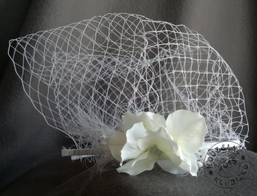Závoj z francouzské síťky, připevněný na kovové bílou atlasovou stuhou potažené čelence, zdobený kvítky hortenzie, pestíky, peříčky, začištěno filcem. Přízdobu budete mít na levé straně hlavy, na přání mohu umístit na druhou stranu. Stačí napsat do poznámky.