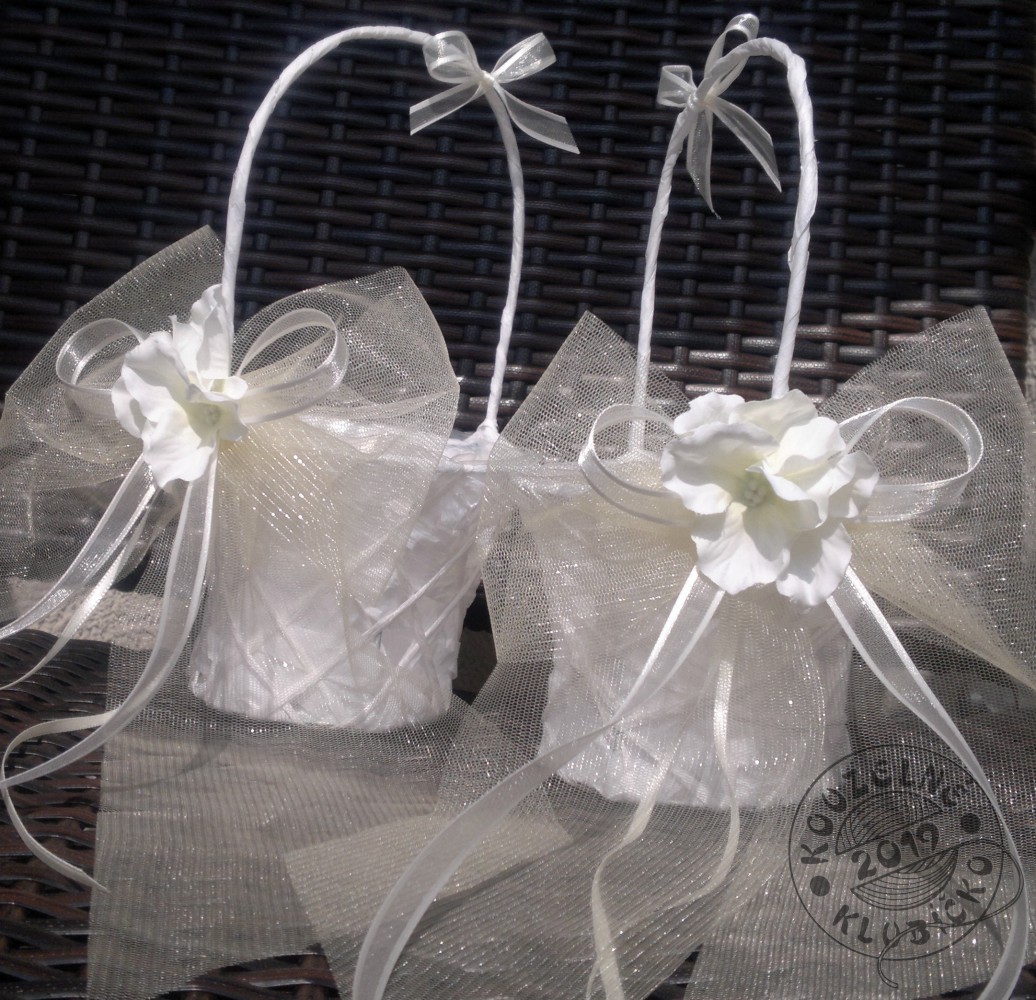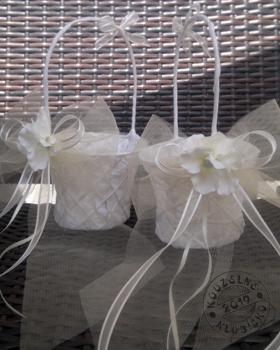 Košík je přizdoben jemným tylem, monofilovou a atlasovou stužkou, pestíky a kvítky hortenzie - zdobeno v odstínu champagne/smetanová.