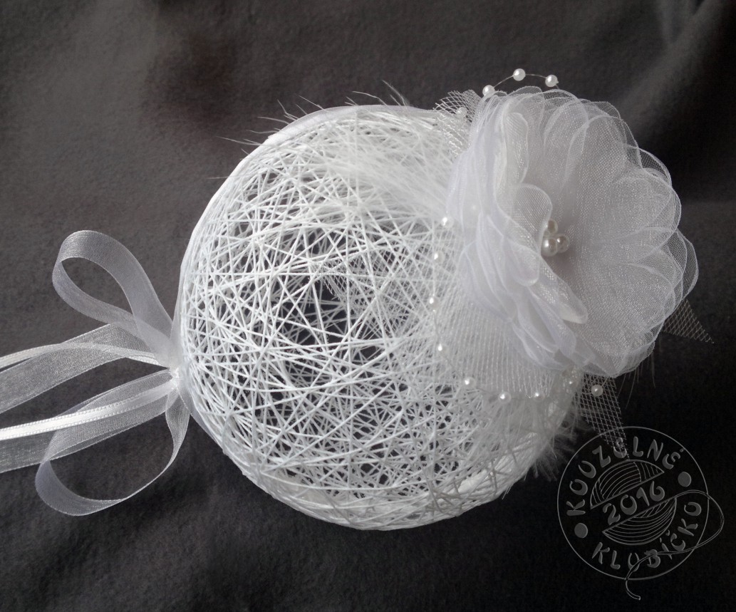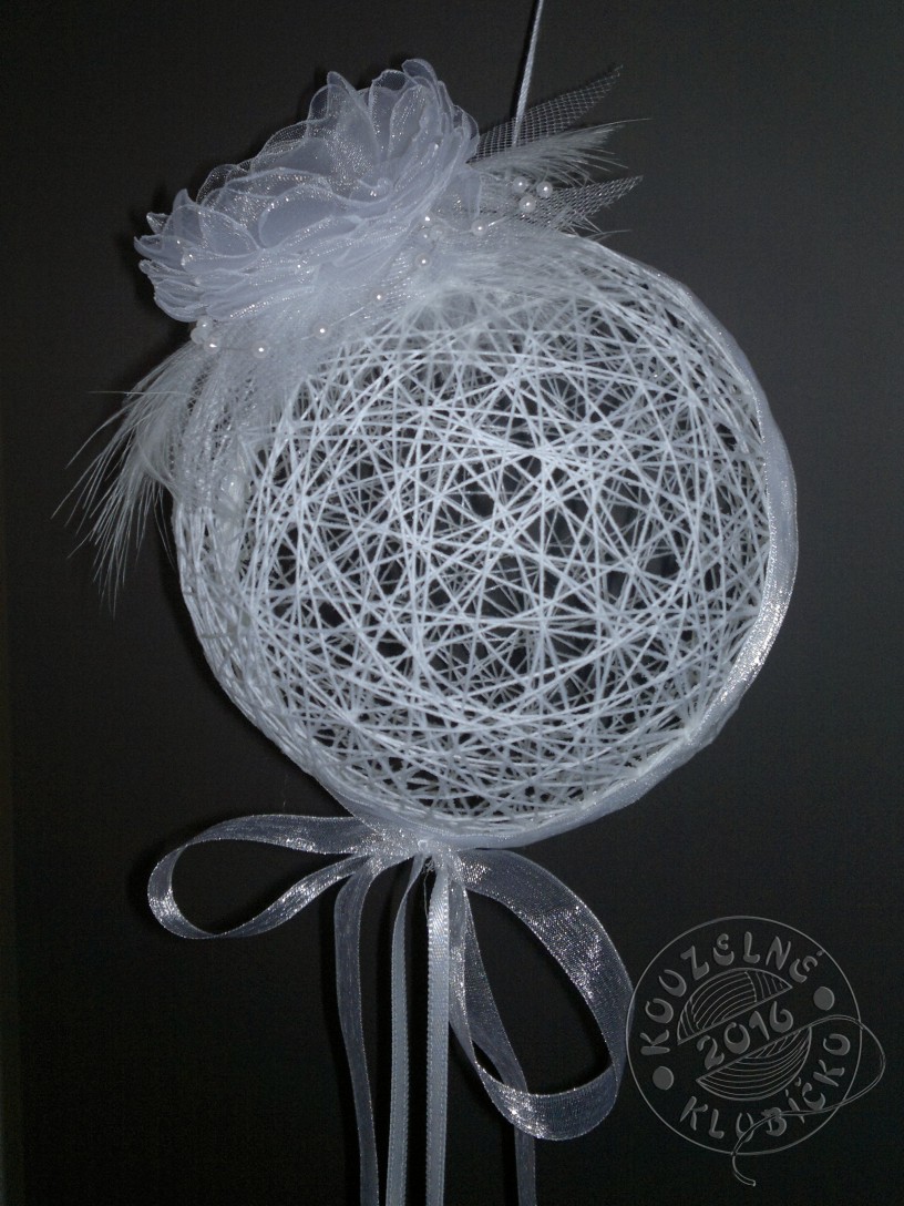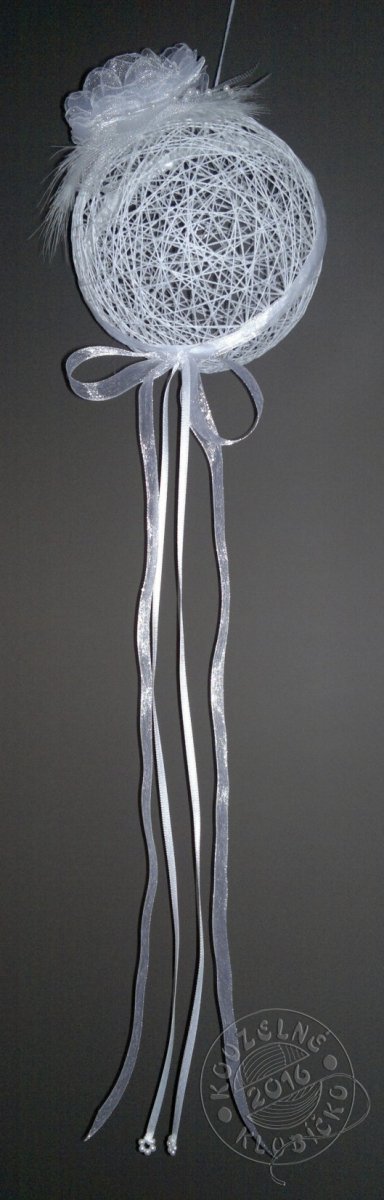 Romantická koule motaná z bavlnek, silně natužená škrobem, opatřená poutkem na zavěšení, zdobená vlastnoručně vyrobeným květem z organzy, tylem, peříčky, perličkami, šifonovou stuhou, satenovou stužkou a perleťovými kolečky-věnečky. Vše v bílé barvě.