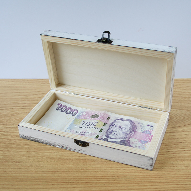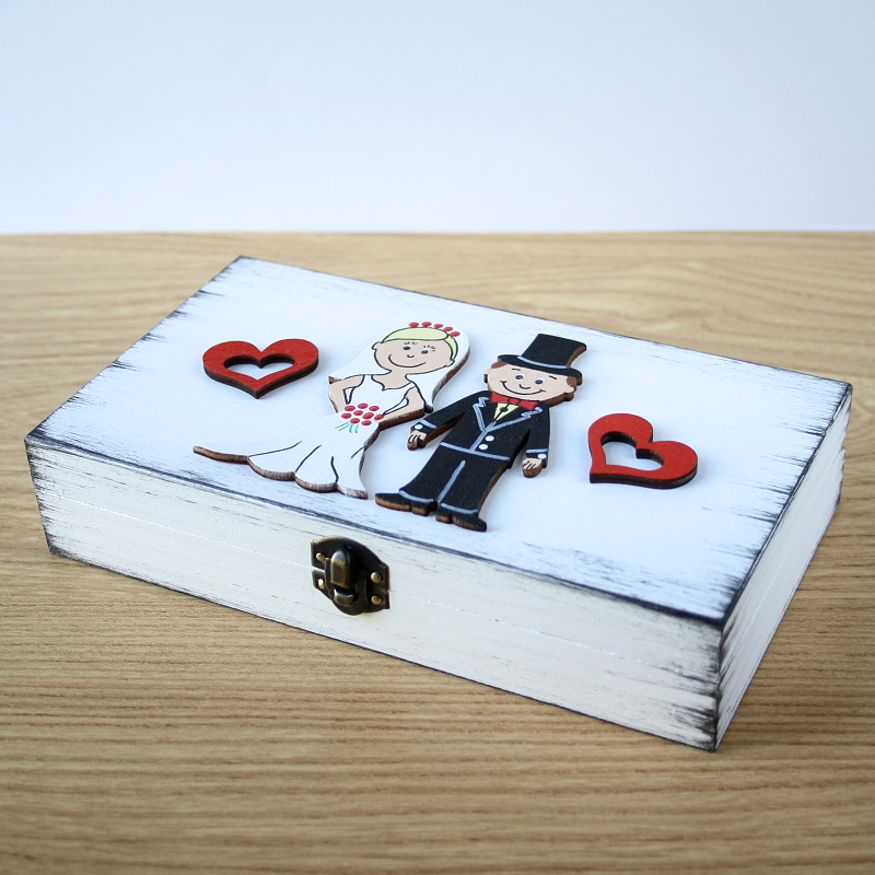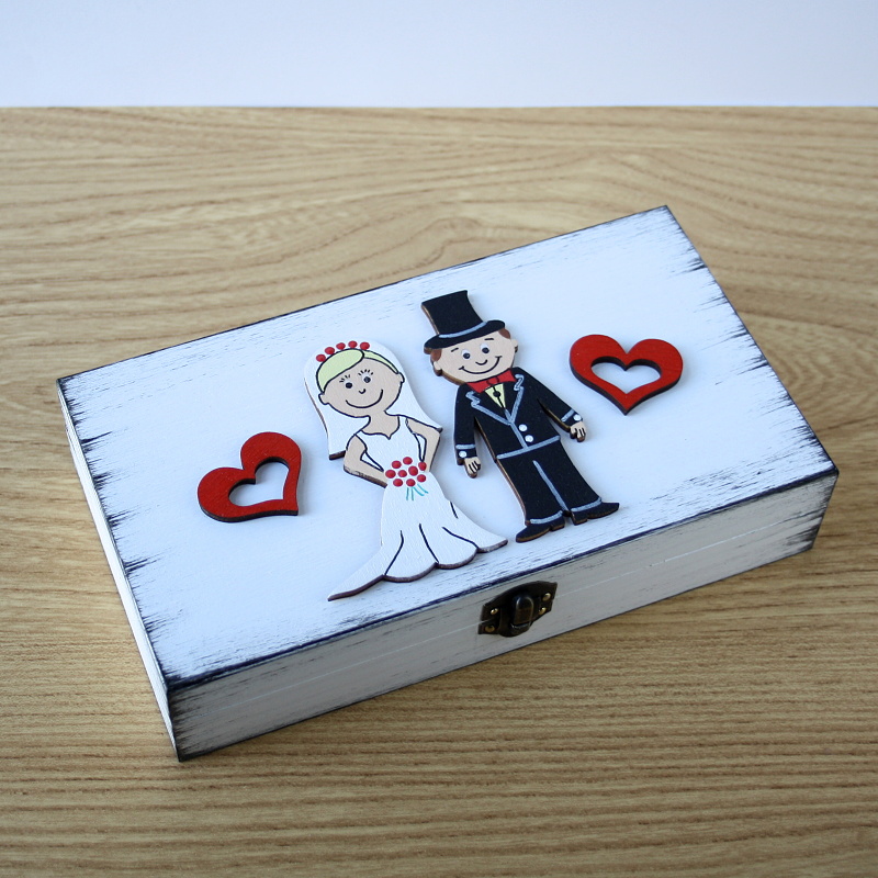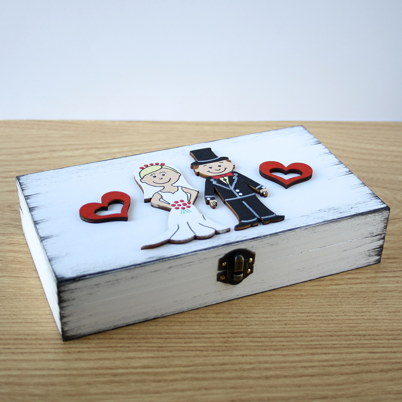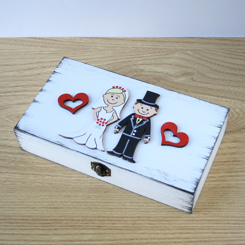 Dřevěná ručně malovaná krabička, patinovaná, ozdobená malovanými výřezy novomanželů a dvěma srdíčky. Malováno akrylovými barvami, uvnitř ponechána přírodní. Vnější rozměry krabičky: 18 x 10 x 3,5 cm, vnitřní rozměry tak akorát na tisícovku.