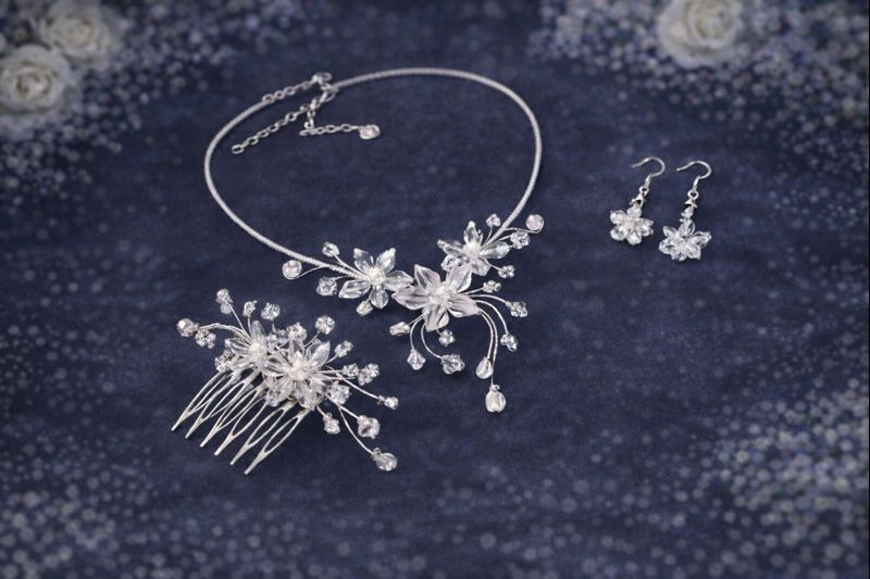 Svatební náhrdelník s čirými květy působí jemně a luxusně, dlouhé náušnice opticky prodlužují krk a vlasový hřebínek dokonale zapadne do romantického svatebního účesu. Šperkový set je ideální ke krajkovým i minimalistickým svatebním šatům a hodí se pro tradiční i moderní svatby.