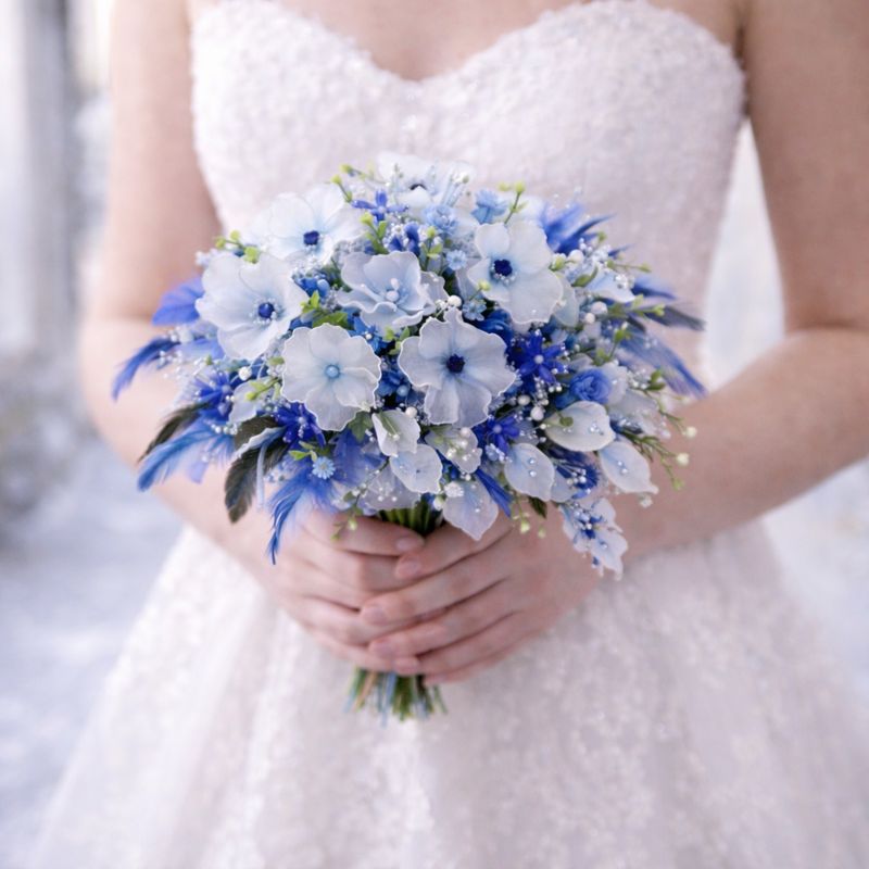 Tato originální svatební kytice je ručně vyráběným doplňkem pro nevěstu, která hledá něco výjimečného, lehkého a nadčasového. Jemné nylonové květy působí vzdušně a romanticky, zatímco detaily z postříbřeného drátku dodávají kytici luxusní třpyt a elegantní strukturu.