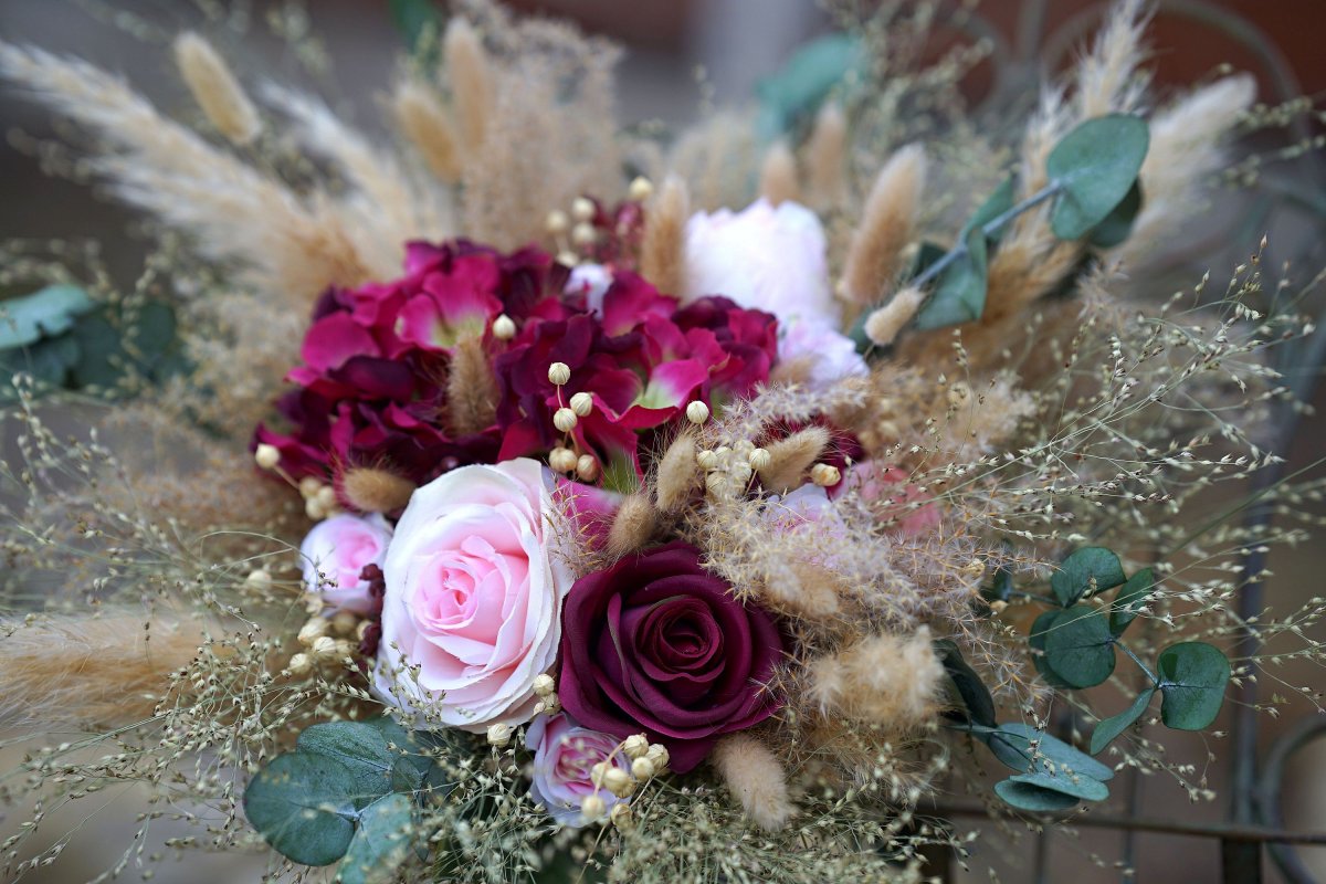 Velká svatebí kytice ve volném stylu vhodná na boho svatby. Látkové květiny, sušina a stabilizovaný eukalyptus.