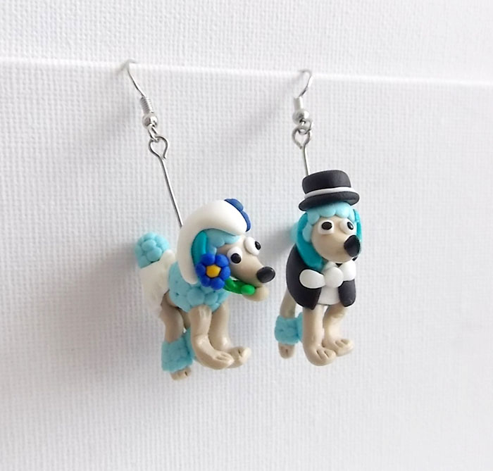 Visací fimo náušničky v podobě načechraných pudlíků - svatebčanů. Včetně gumových zarážek.