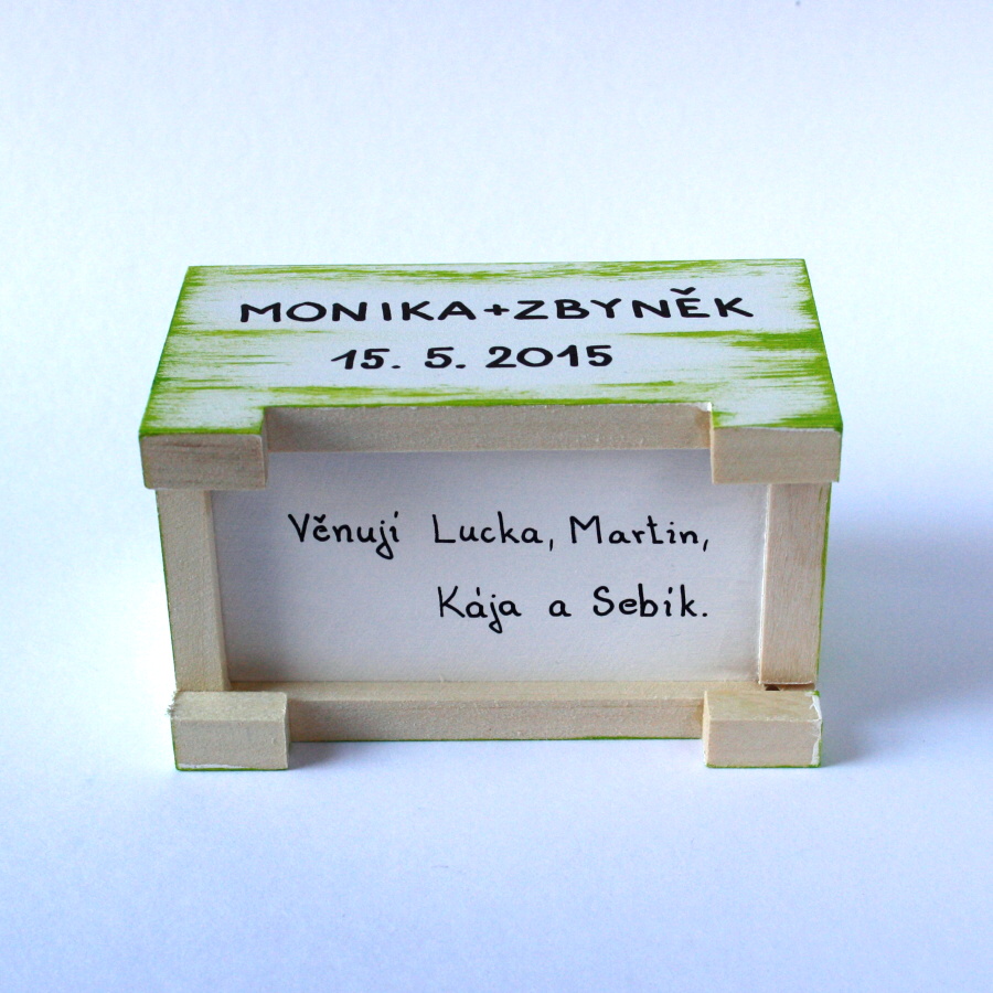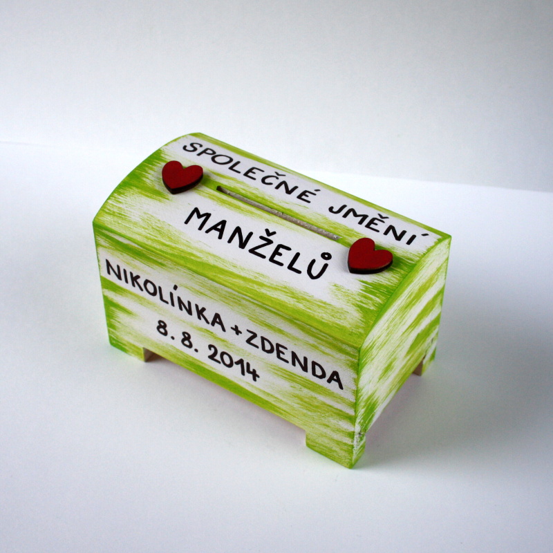 Dřevěná pokladnička je pečlivě opracovaná, ručně malovaná akrylovou barvou a decentně žíhaná. Dozdobená je dvěma dřevěnými výřezy srdíček. Rozměry cca 11,5 x 7 x 7 cm.