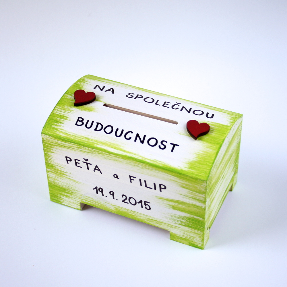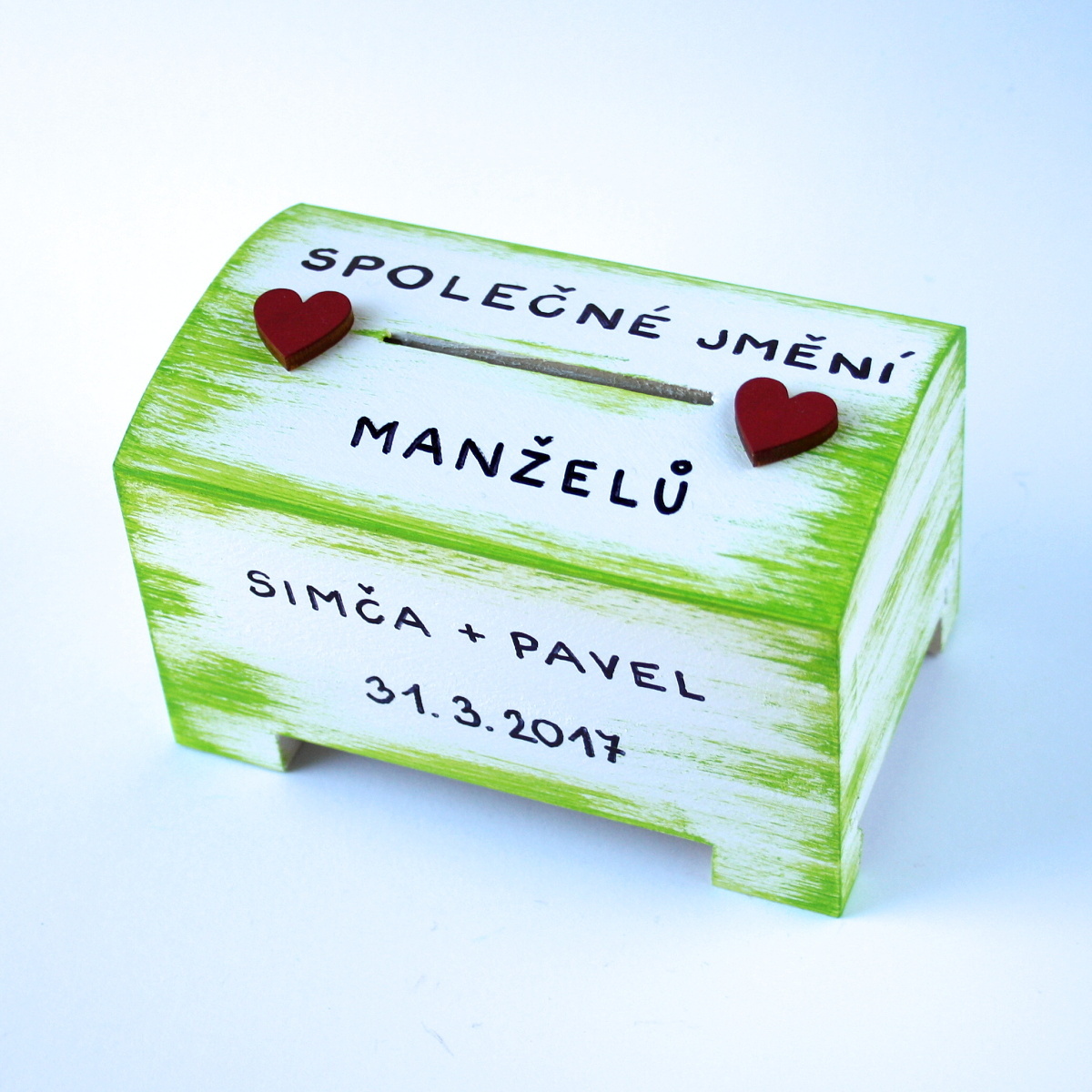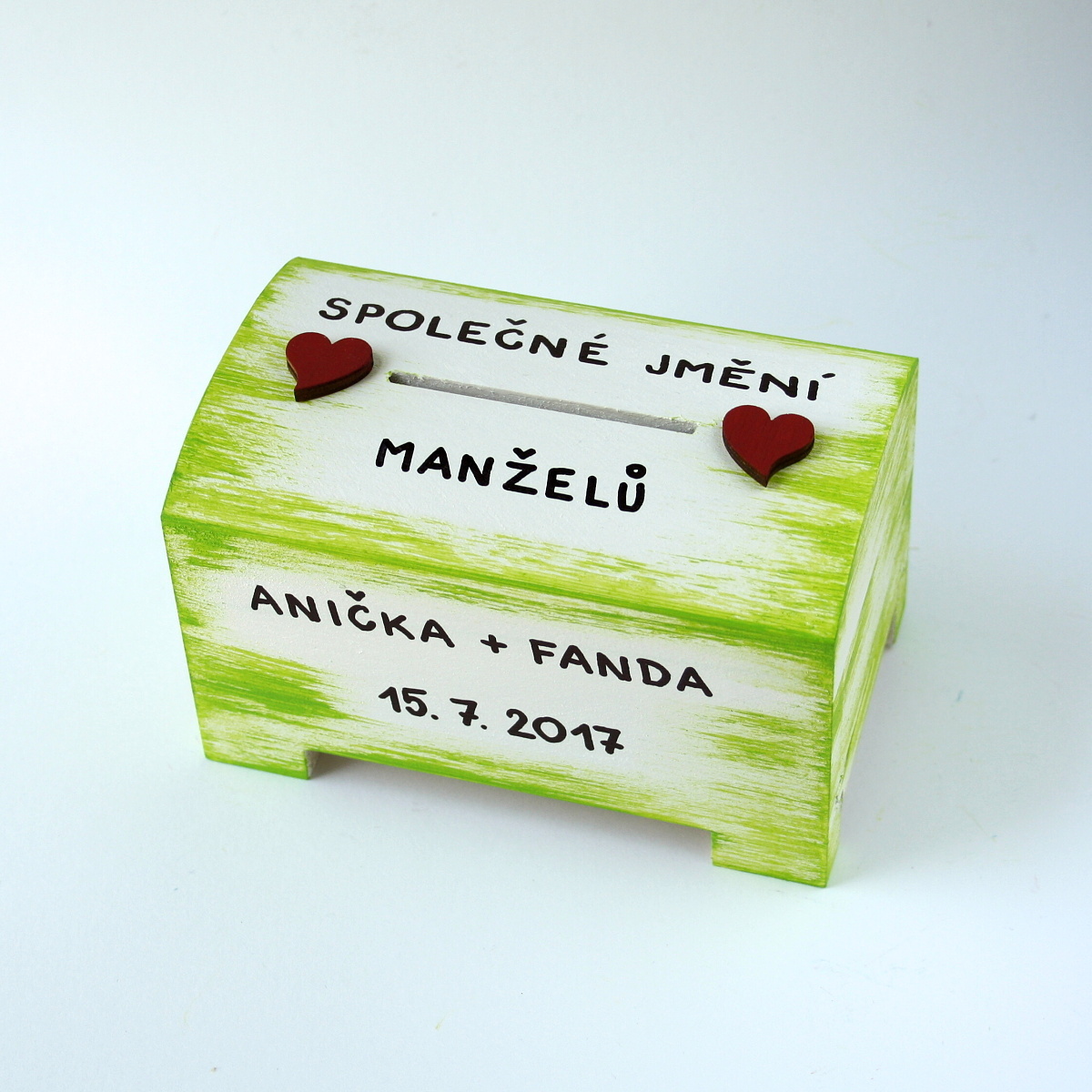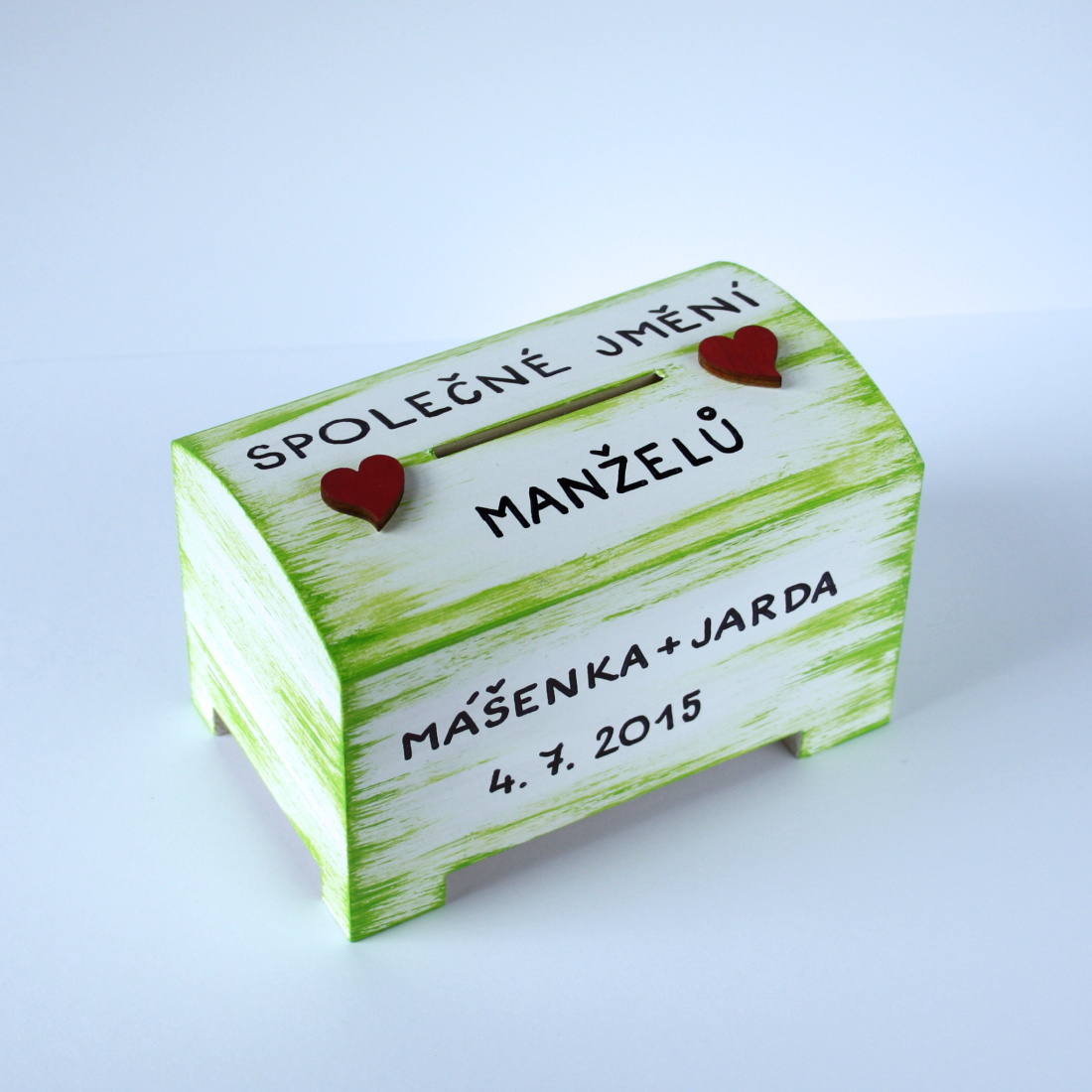 Pokladnička má vysouvací dno pro snadné vysypání úspor. Dobře poslouží k uložení peněžního svatebního daru.