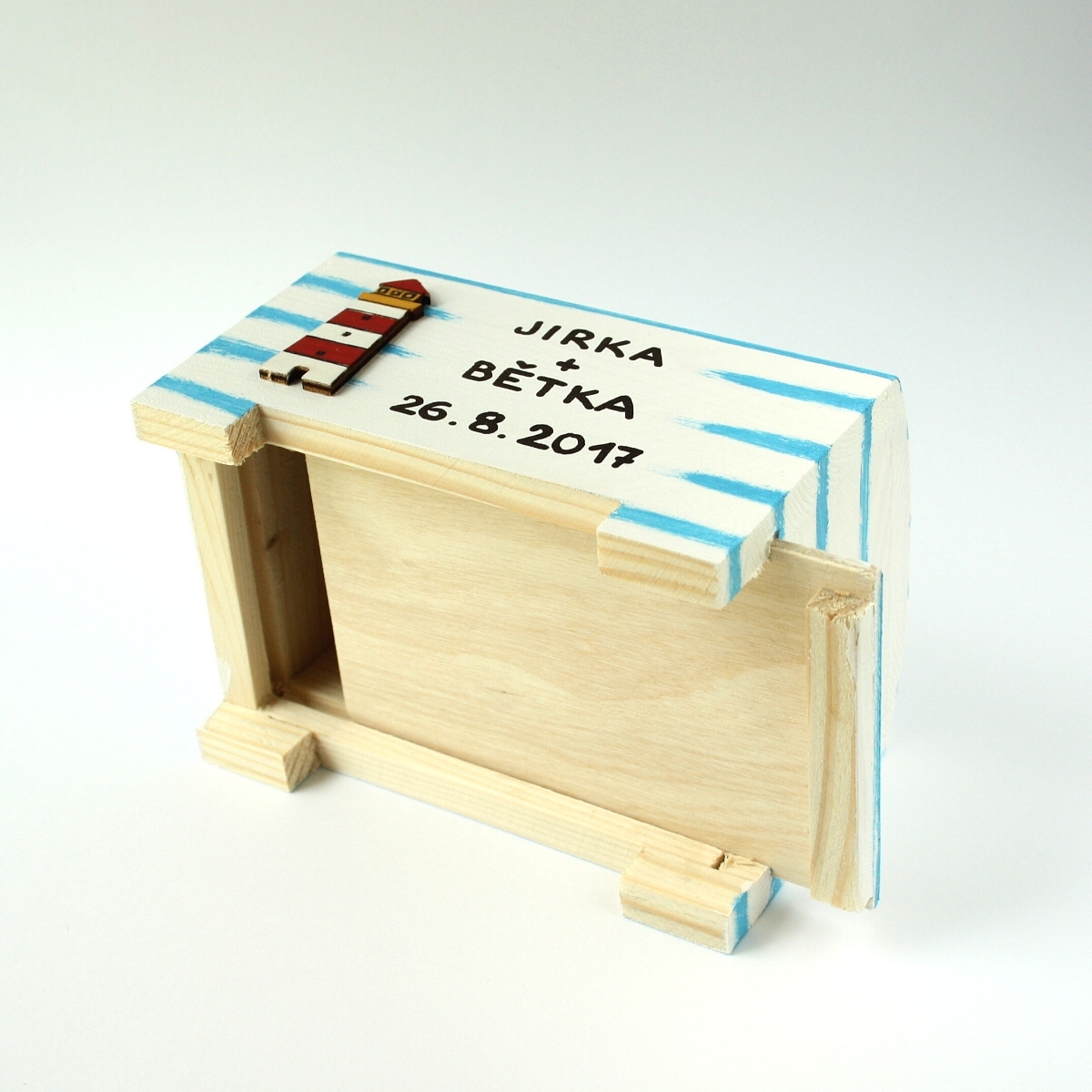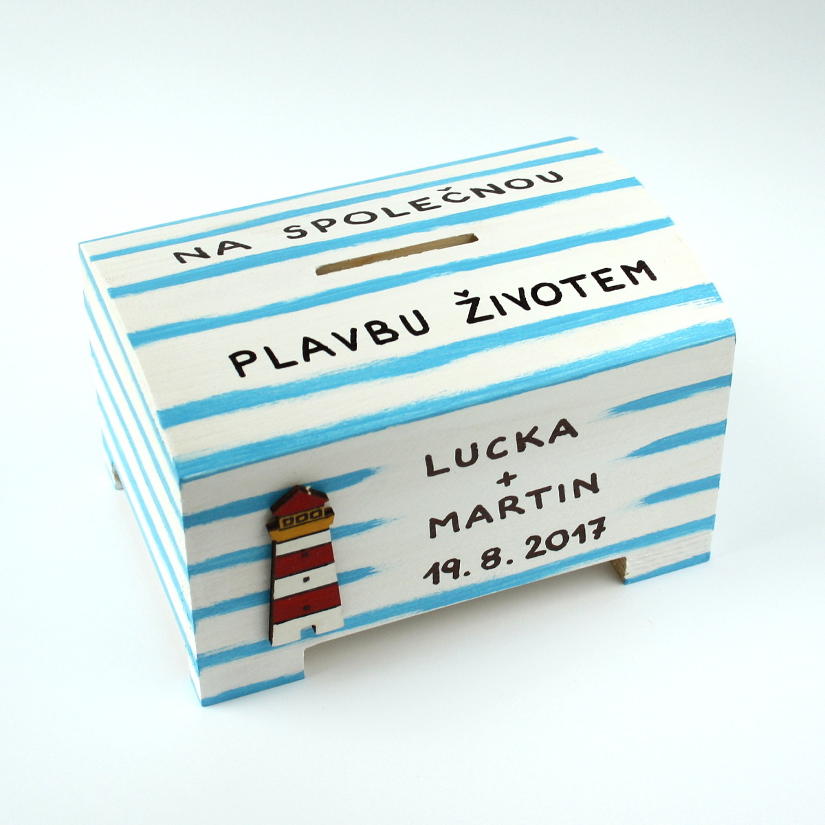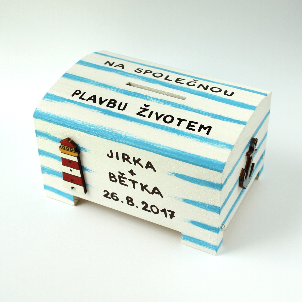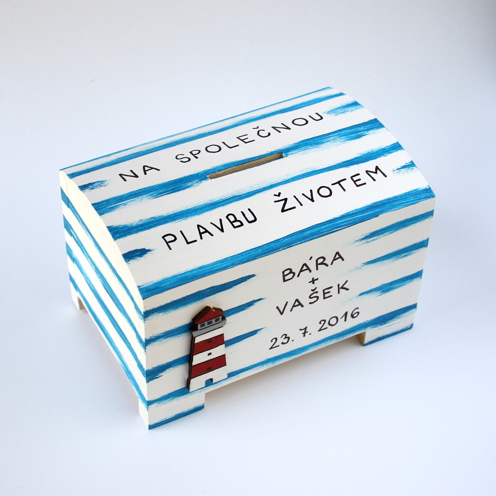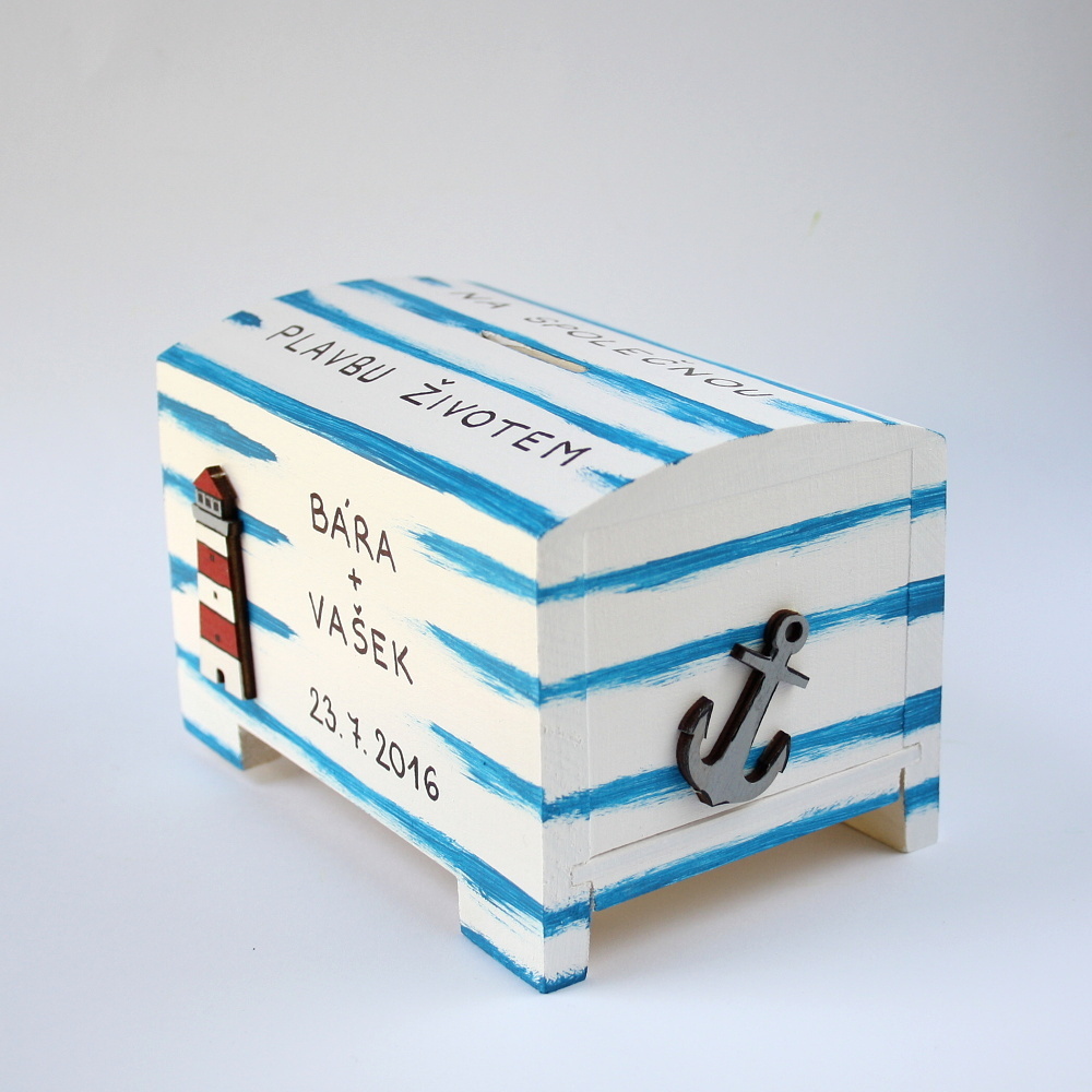 Dřevěná pokladnička je pečlivě opracovaná, ručně malovaná bílou akrylovou barvou a modře žíhaná. Dozdobená je dřevěnými výřezy majáku a kotvy. Rozměry pokladničky cca 12,5 x 9 x 7,5 cm.