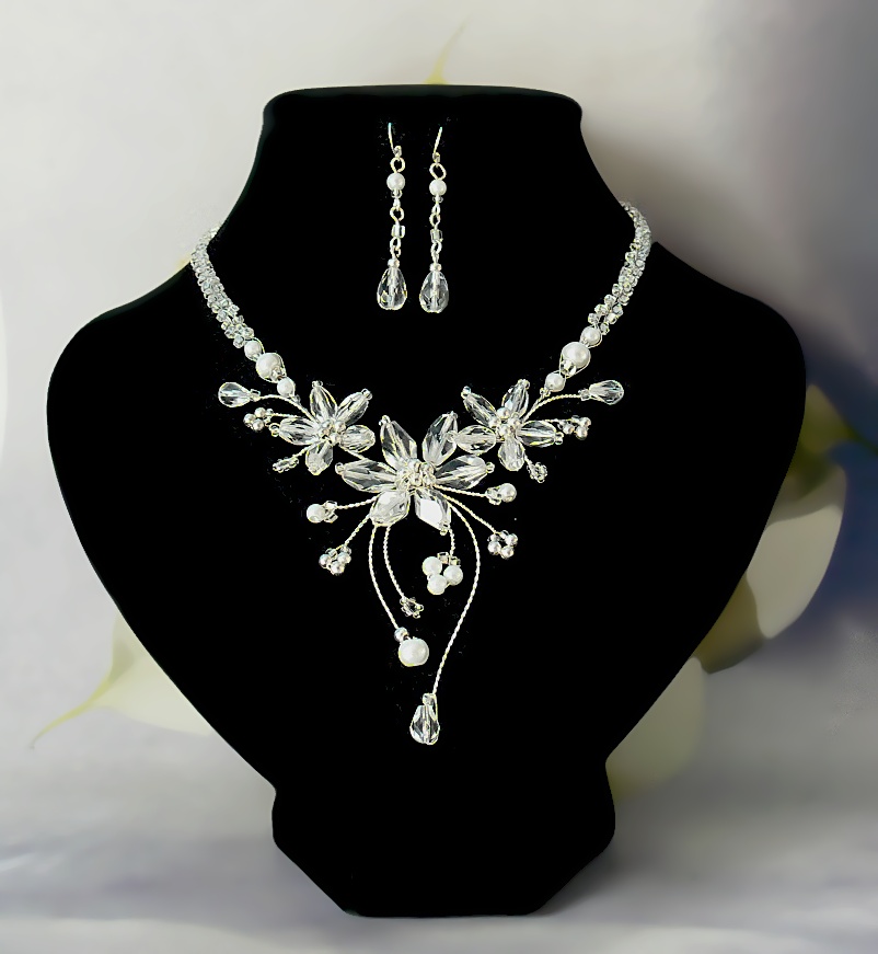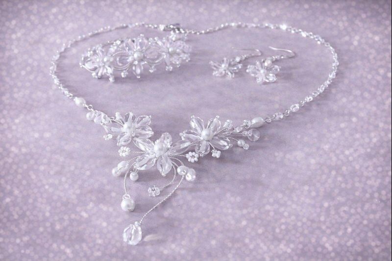 Jemný ručně vyráběný svatební šperkový set tvořený náhrdelníkem, náušnicemi a náramkem okouzlí svým lehkým květinovým designem. Kombinace čirých krystalů, perel a drobných detailů vytváří romantický a nadčasový celek, který krásně doplní svatební šaty i další slavnostní outfity.