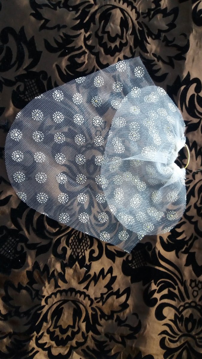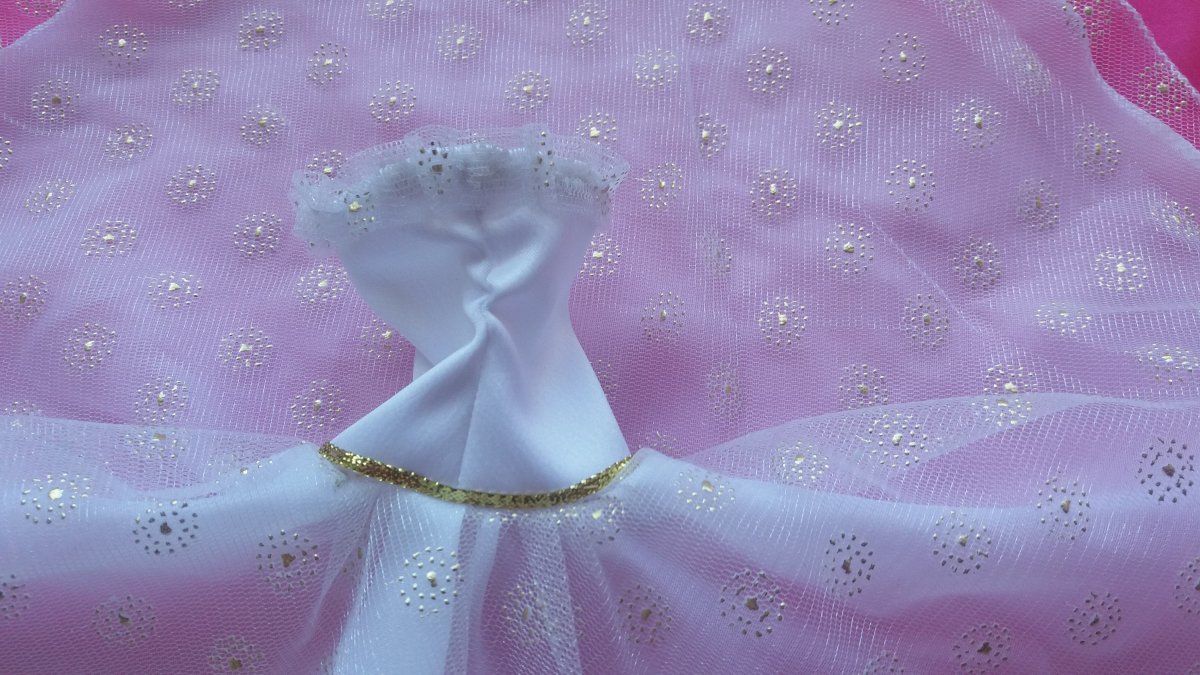 saténový živůtek je ozdobenen volánkem u výstřihu, vrchní sukně je monofilová se zlatými kytičkami, spodní z PE, v pase je zlatá stužka, zapínání je vzadu na suchý zip. Závoj je našit na gumičce