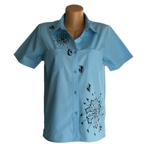 Světle modrá dámská halenka ručně malovaná černou barvou.