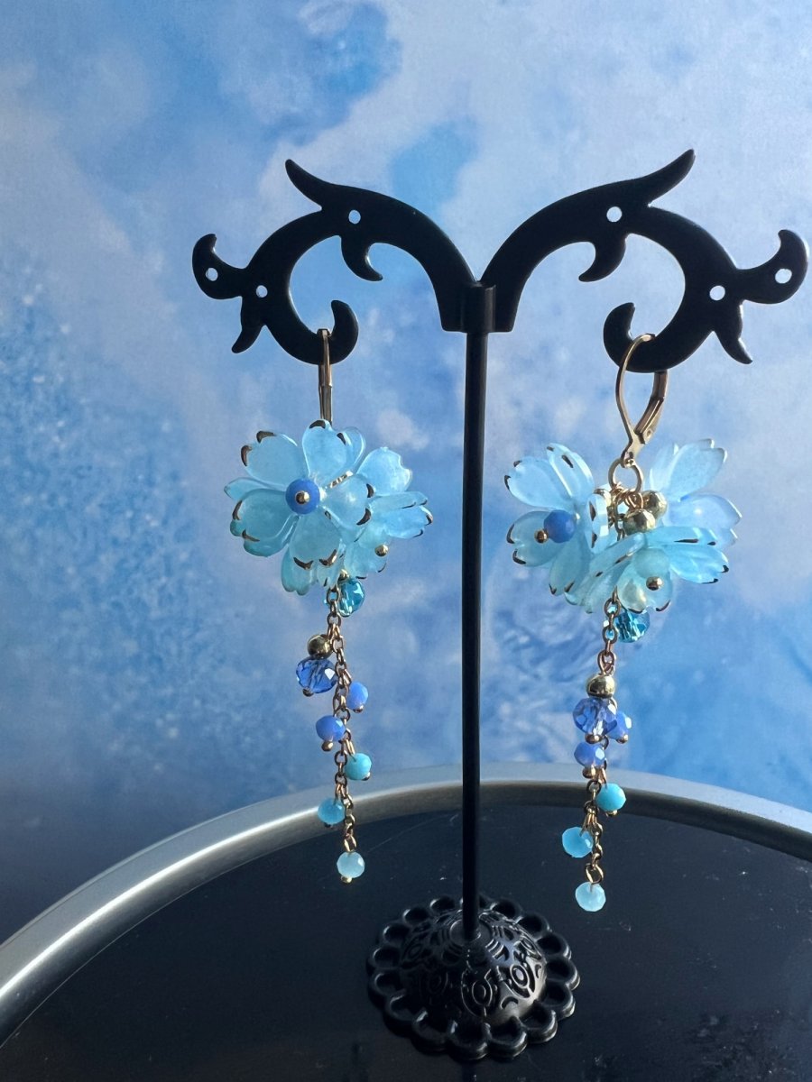 Dlouhé náušnice s plastovými květinkami a drobnými broušenými korálkami na pozlacených kroužkách a řetízku. Délka od háčku cca 7 cm, uzavíratelný háček z nerez oceli