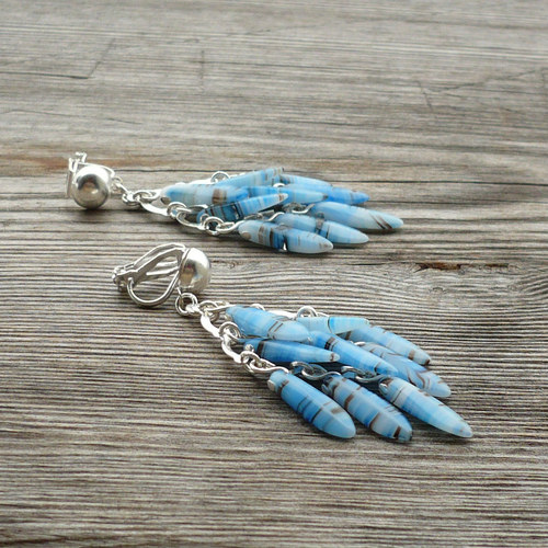 Náušnice jsou tvořeny z uspořádaných světle modrých žíhaných skleněných korálků do tvaru kosočtverce.