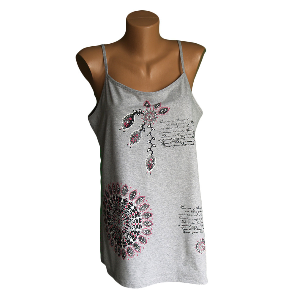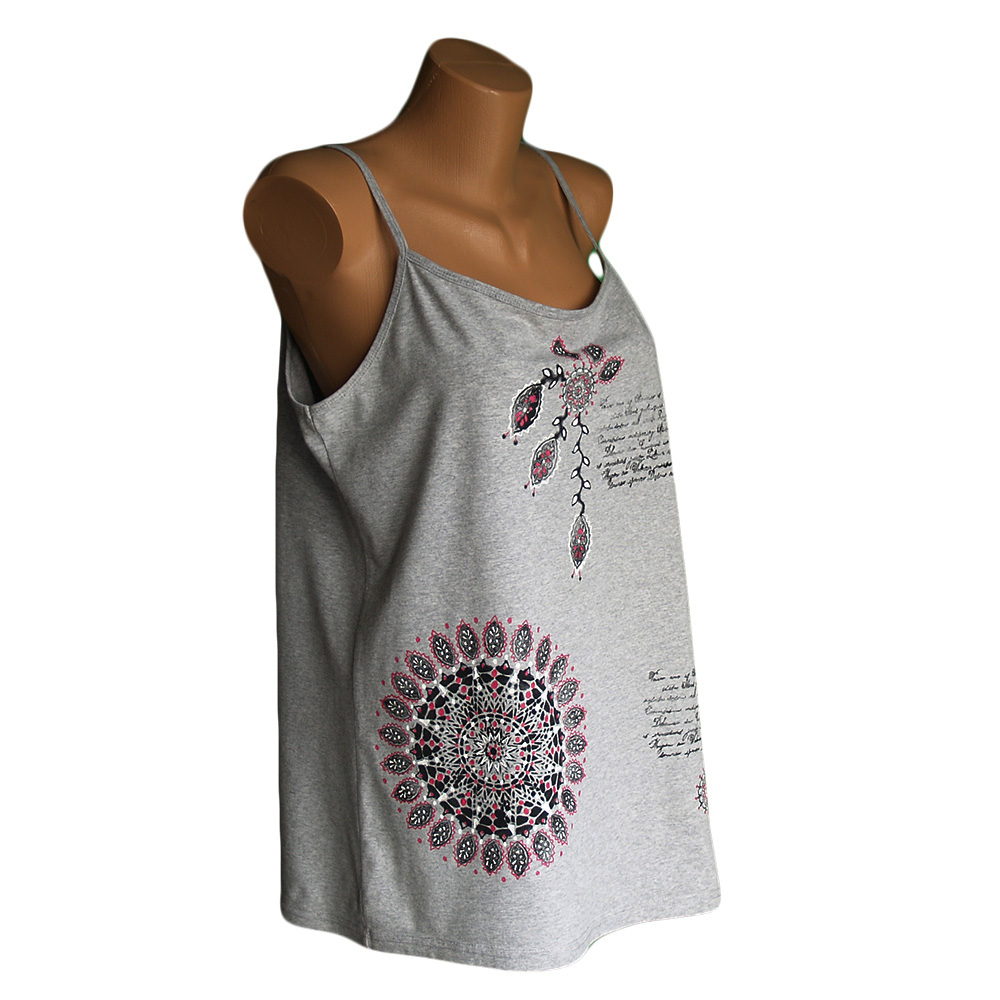 Ručně malované a tištěné světle šedé tílko se špagetovými ramínky. Přední díl zdobený tmavě růžovou, bílou a černou barvou.