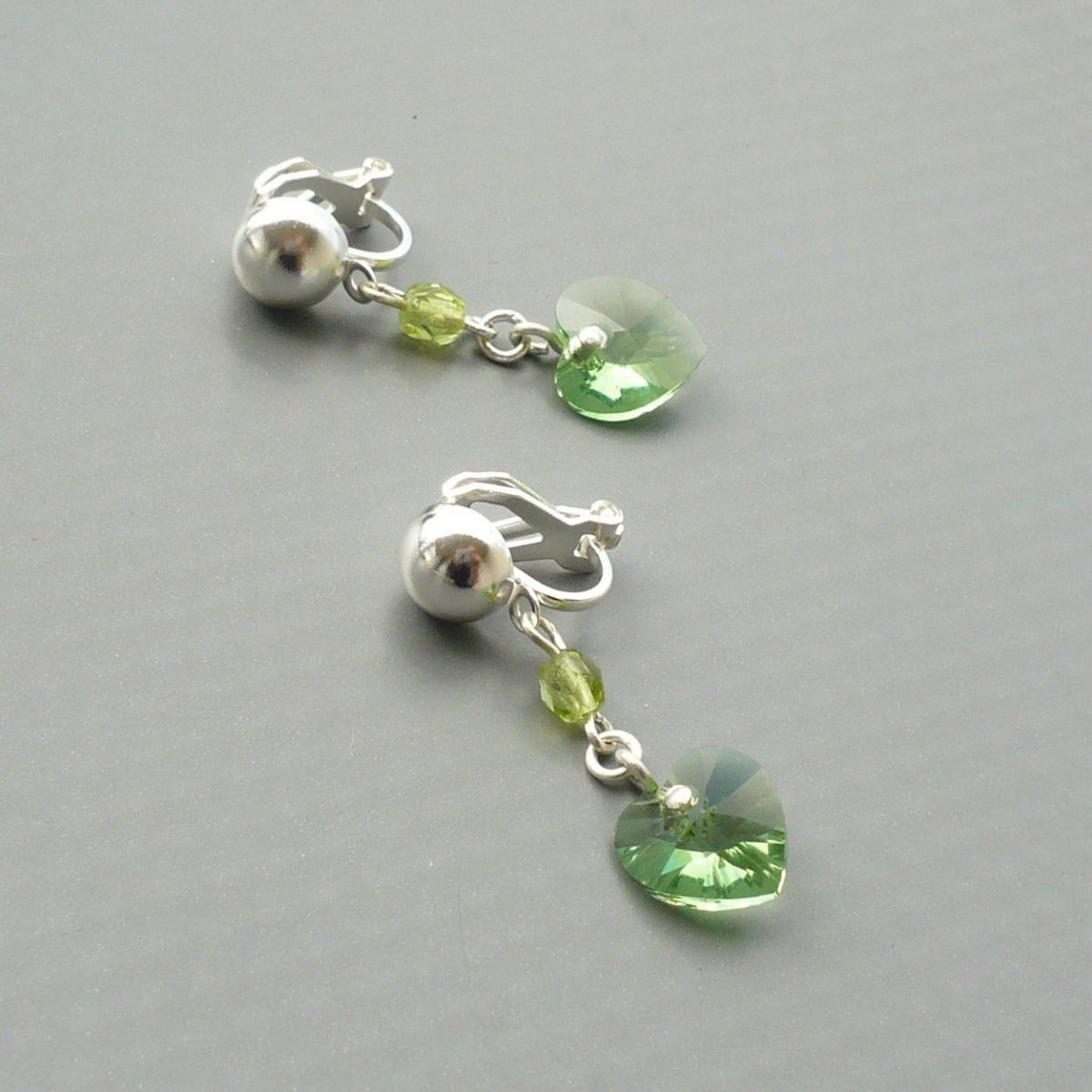 Precizně vybroušené malé světle zelené Swarovski srdíčko a světle zelený broušený skleněný korálek jsou zavěšeny na klipsovém zapínání - na toto zapínání není potřeba mít propíchnutá ouška. V případě zájmu přendám na zapínání pro propíchnutá ouška.