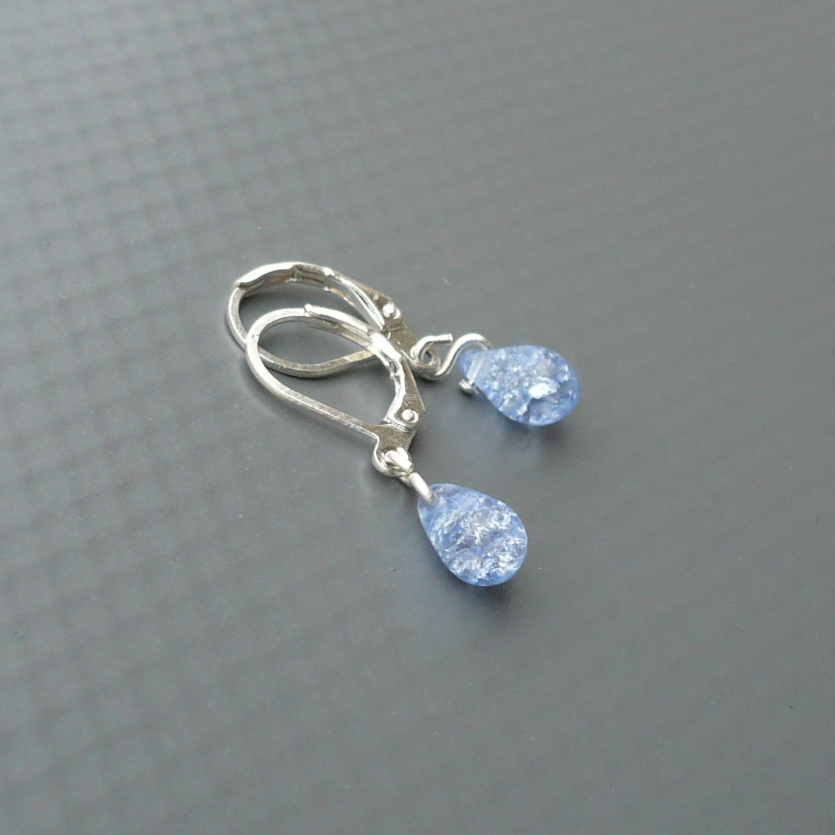 Jemné náušnice z světlounce modré skleněné kapky s ozdobným efektem rádoby popraskané vnitřní struktury.