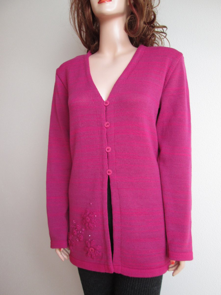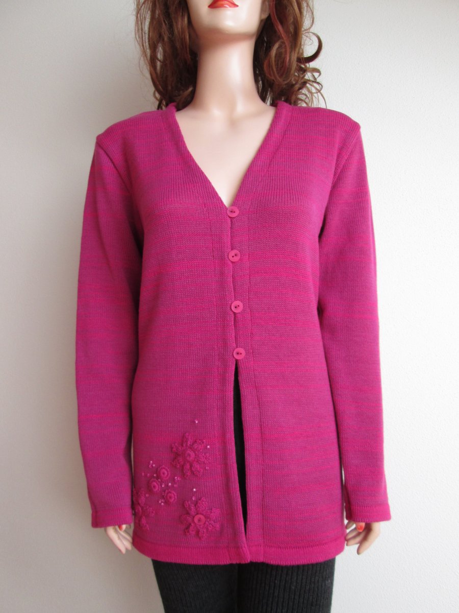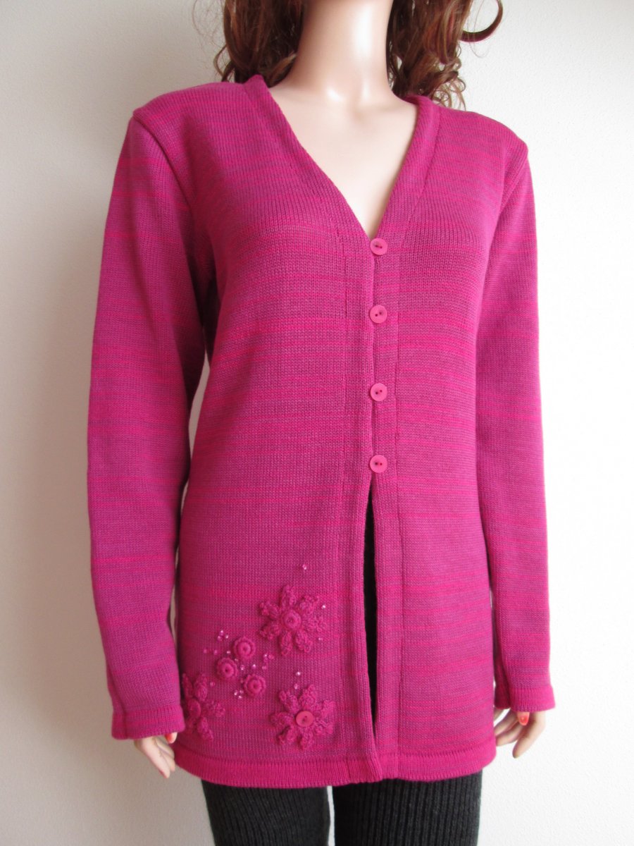 Zapínání je na 4 menší knoflíčky a poutka. V těle je mírně probraný. Svetřík zdobí aplikace ( háčkování, korálky ) ve spodní části jednoho předního dílu.