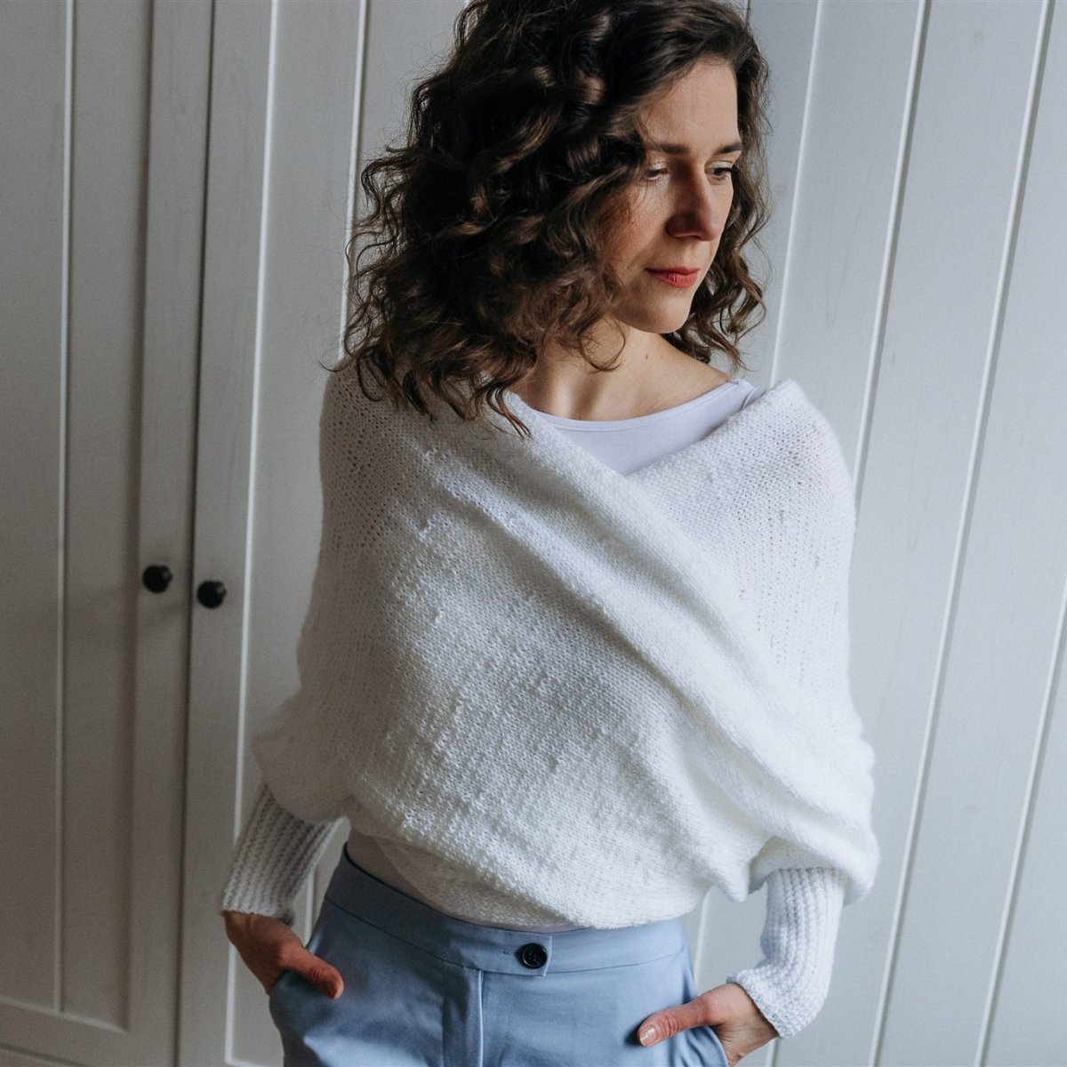 Tento svetr - pléd je spojením dvou výrobků. Elegantního plédu a teplého svetru. Jeho předností je oblékání bez nutnosti přetahovat svetr přes hlavu, jednoduše navléknete rukáv, pléd omotáte kolem těla a navléknete rukáv druhý.Lze nosit s překřížením vpředu i vzadu. Je vyroben z lehoučké akrylové příze a díky jemnému vzorku jej můžete použit jako doplněk ke svatebním šatům a po obřadu využit na běžné nošení.