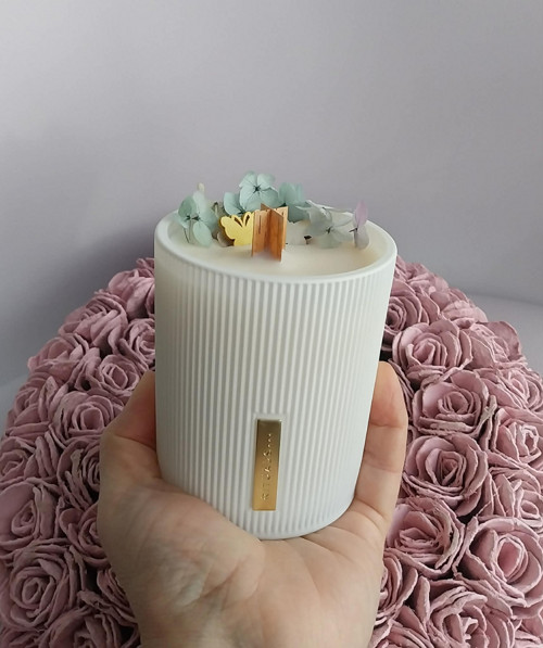 Svíčka v bílé skleněné doze, zdobená sušenými květy a motýlky ze dřeva.