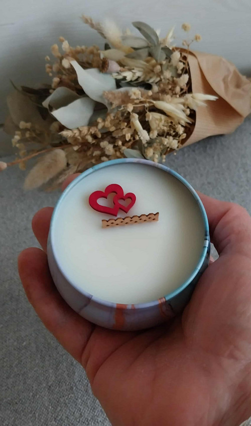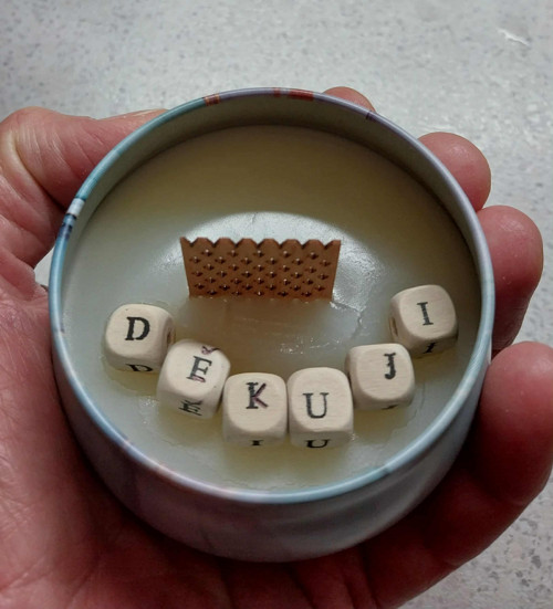 Svíčka v hliníkovém obalu, s ukrytým textem "Děkuji". Slovo děkuji je ukryto pod voskem. Při zapálení svíčky a roztátí vosku se ukáže darovanému text, který určitě potěší. Zdobené srdíčkem.