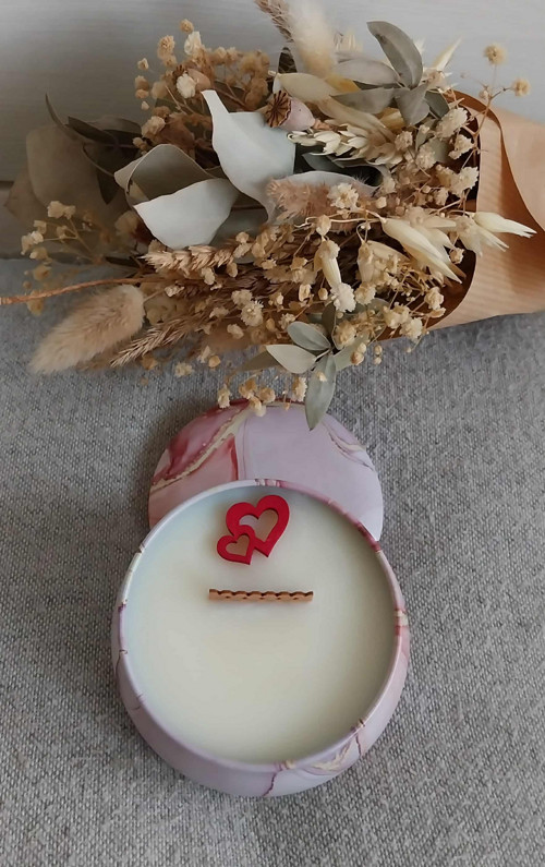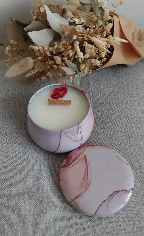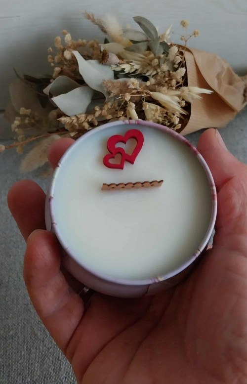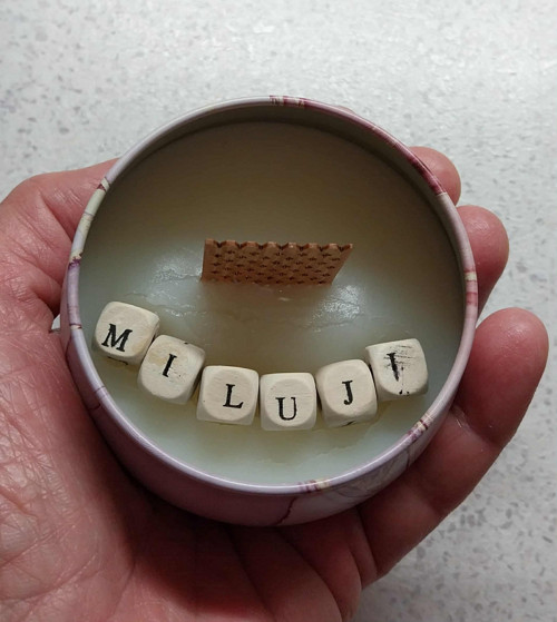 Svíčka v hliníkovém obalu, s ukrytým textem "Miluji". Slovo miluji je ukryto pod voskem. Při zapálení svíčky a roztátí vosku se ukáže darovanému text, který určitě potěší. Zdobené srdíčkem.