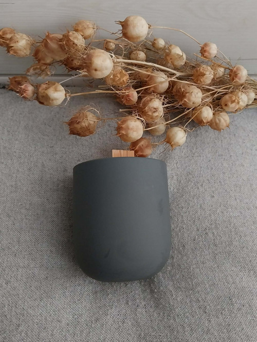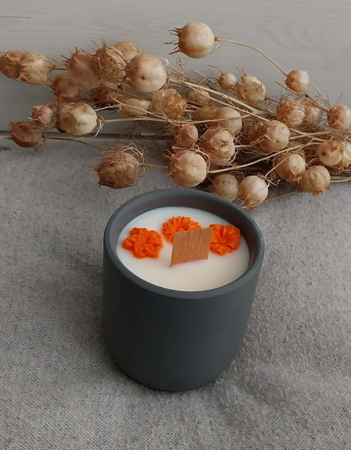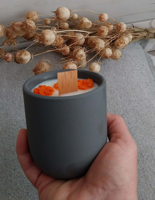 - Přírodní, ručně vyráběná sójová svíčka v betonu.