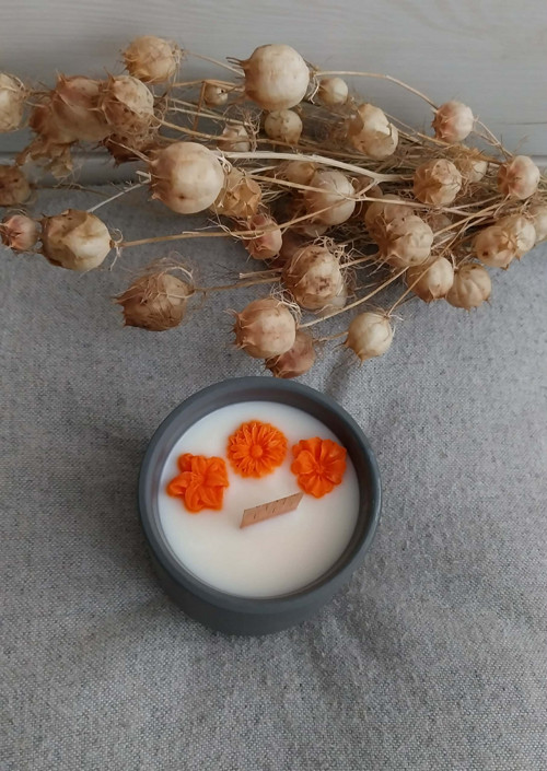 Svíčka v betonové doze. Po vyhoření lze použít jako květináček nebo miska na malé drobnosti. Zdobená květy z vosku.