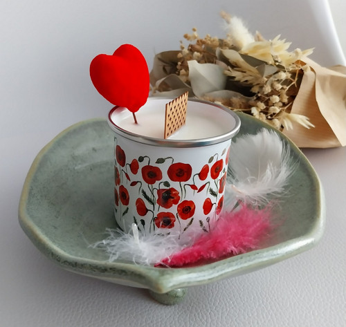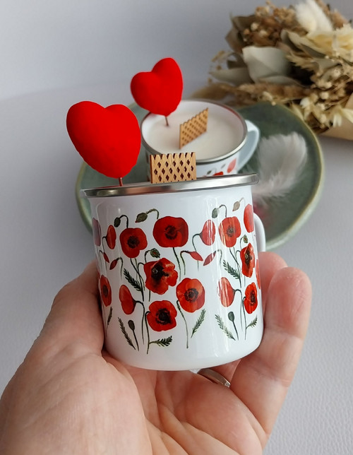 Svíčka v plecháčku, která je velmi oblíbená. Malinký hrníček, který potom zůstane na kávičku udělá radost každý den.