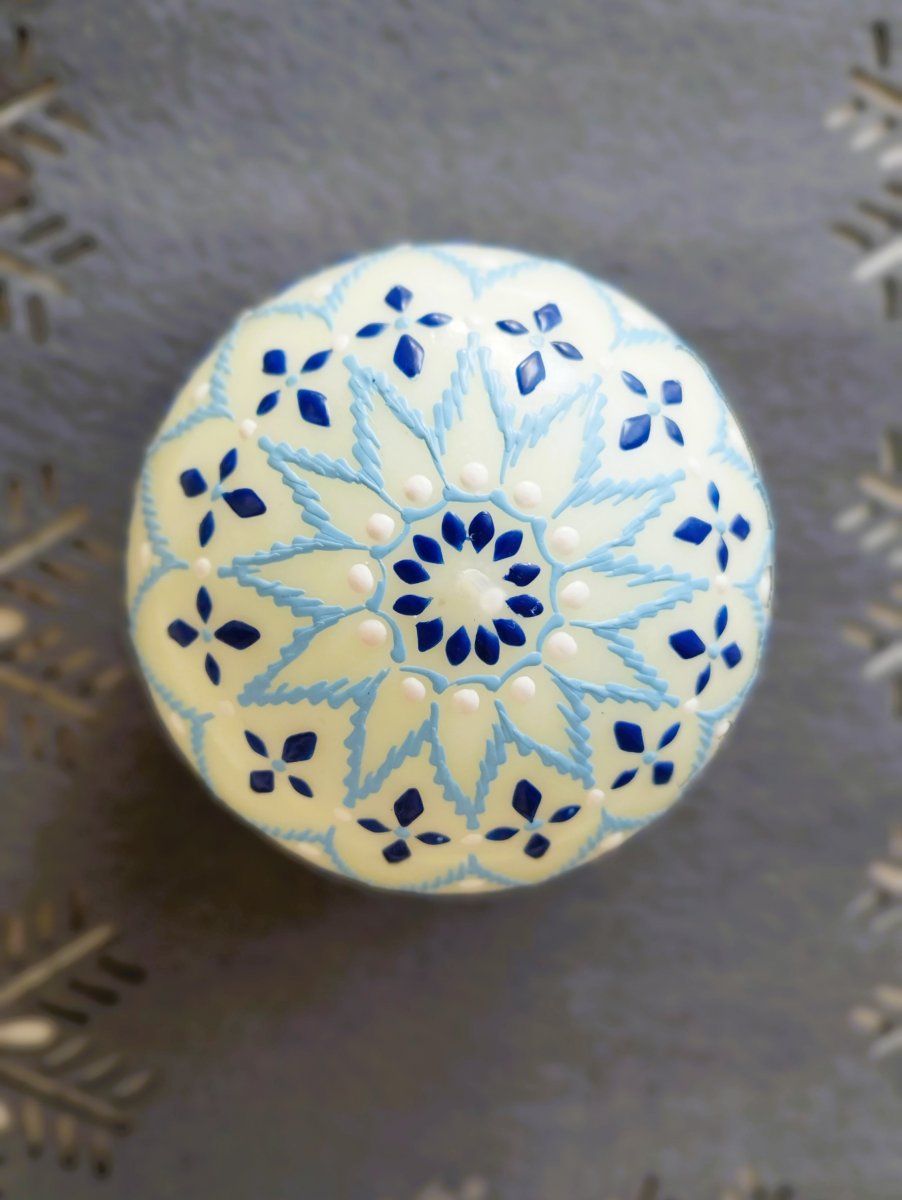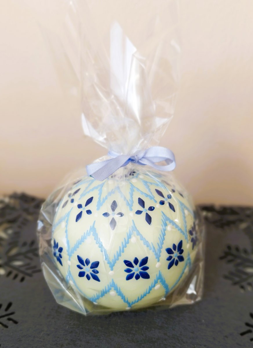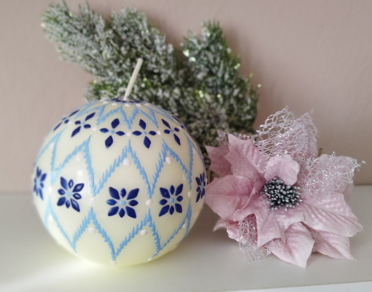 Ručně zdobená svíčka. Motiv zimní, vánoční. Svíčka je kvalitní, od českého výrobce, ručně dozdobená horkým voskem. Možno zapálit, nestéká.