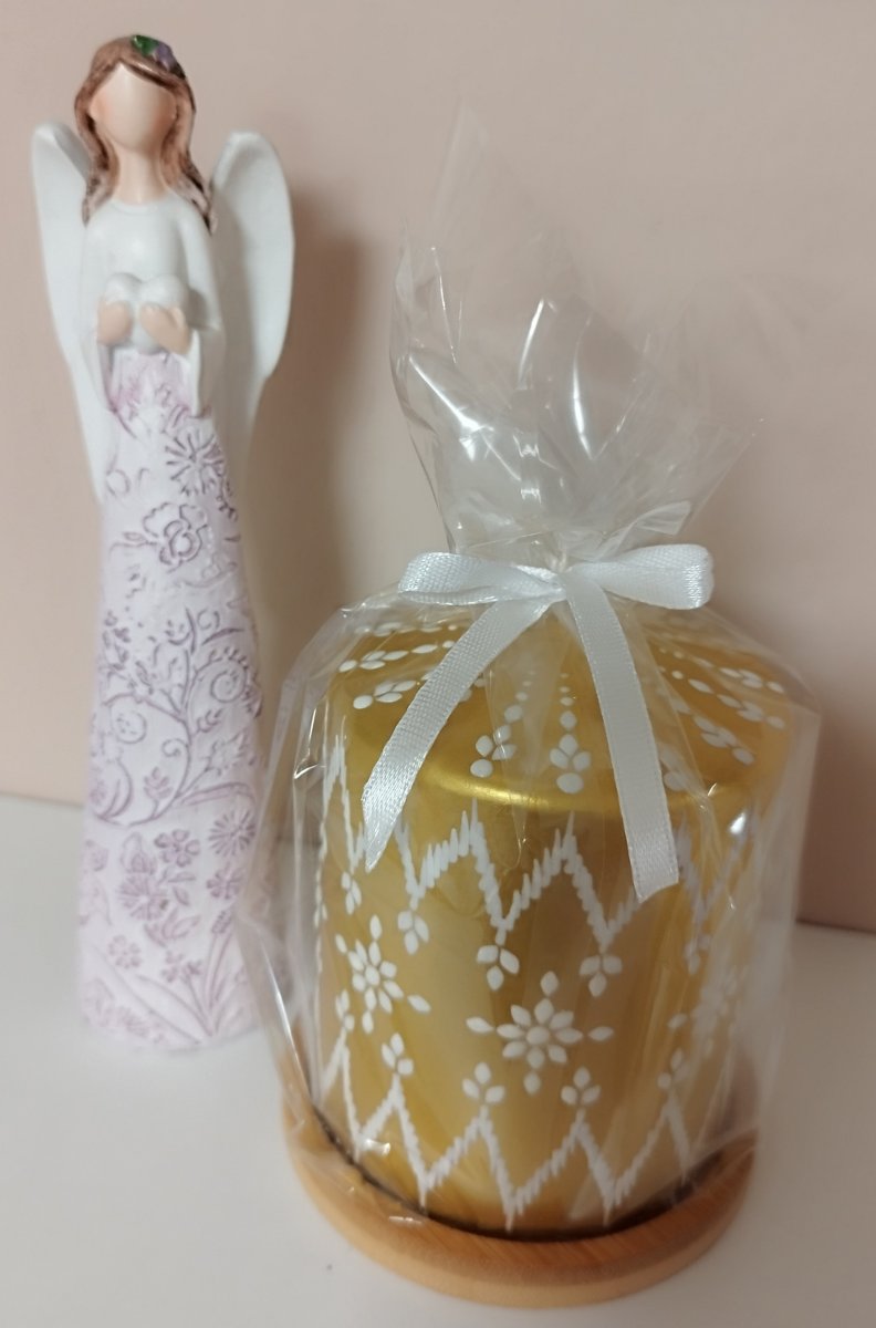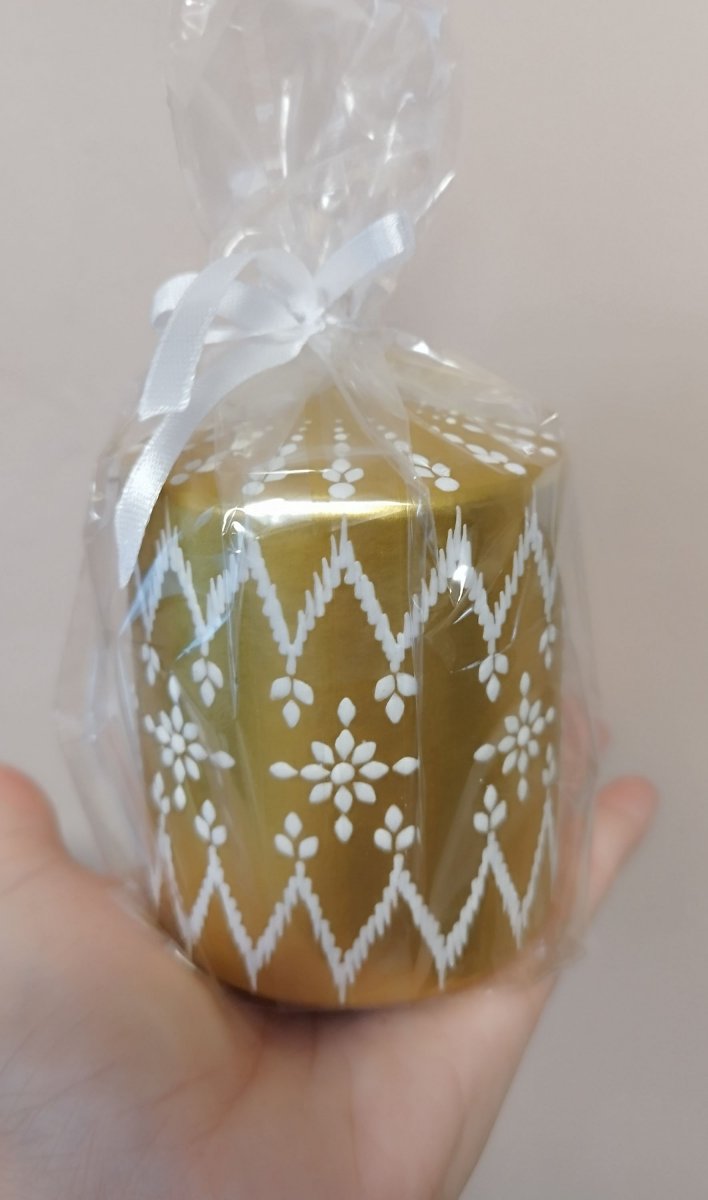 Ručnš zdobená svíčka ve tvaru válce, zdobeno horkým voskem. Svíčka kvalitní, od českého výrobce, možno zapálit, nestéká.