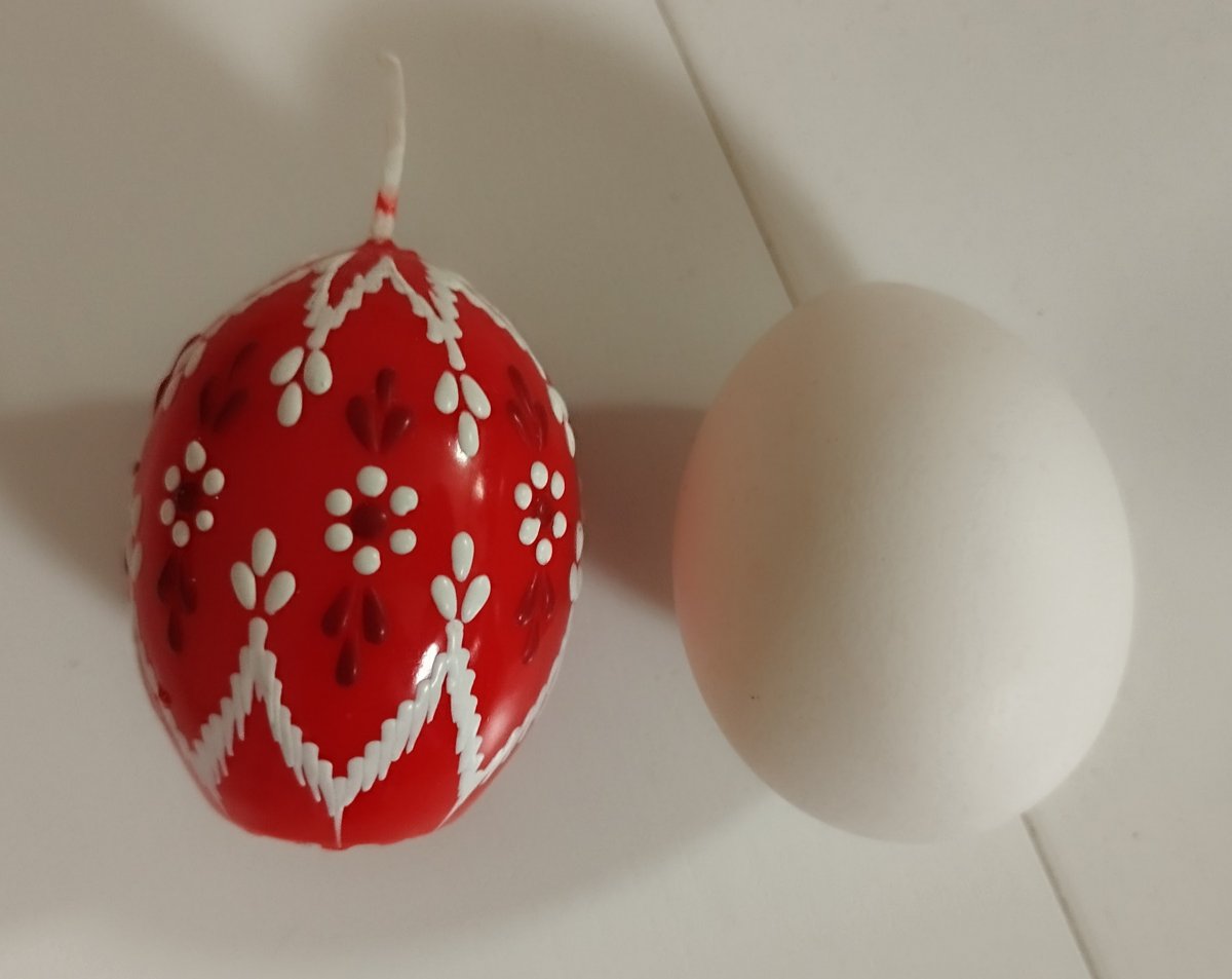 Svíčka kraslice, ručně zdobená horkým voskem, stejnou metodou, jako se zdobí klasické kraslice.