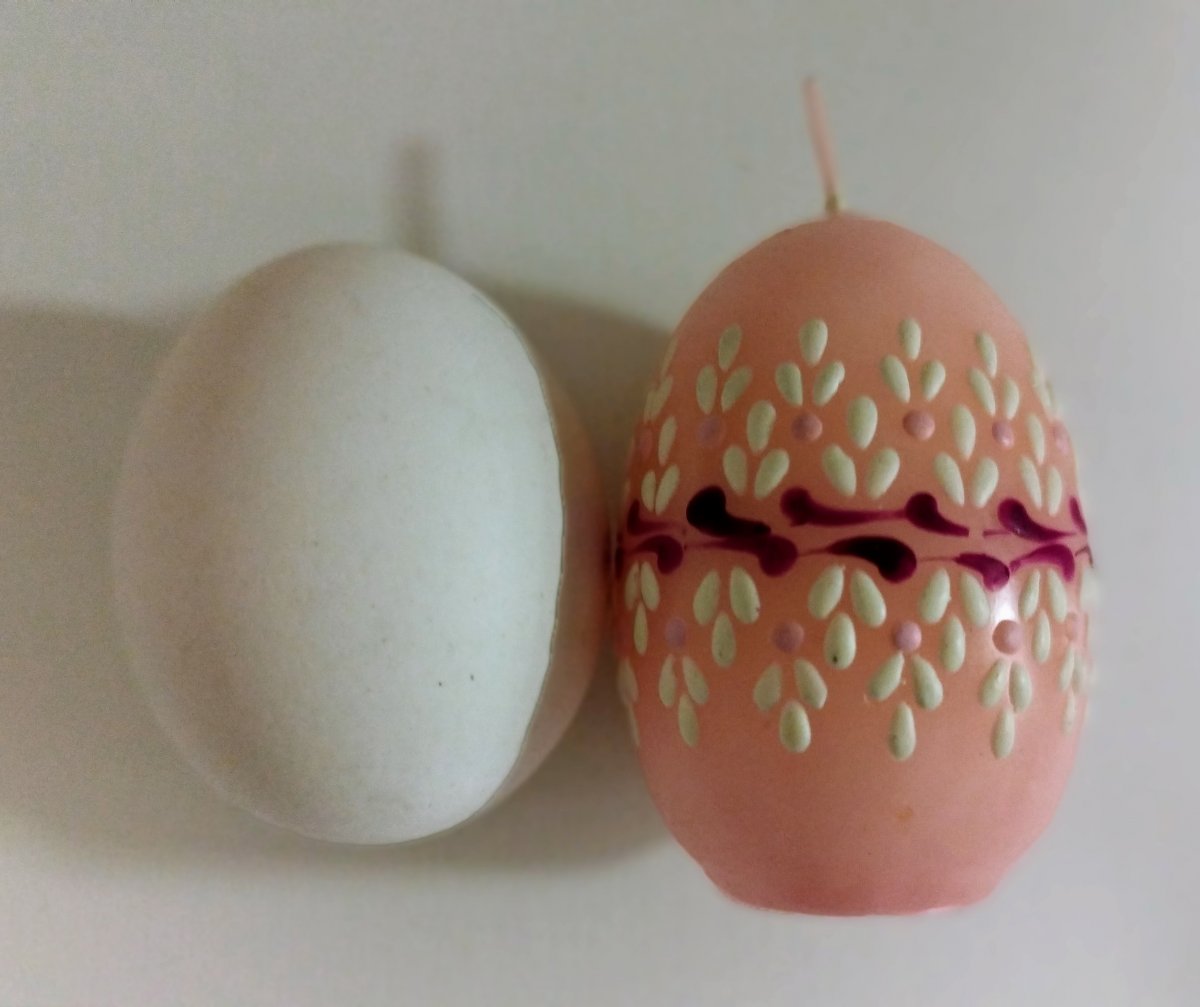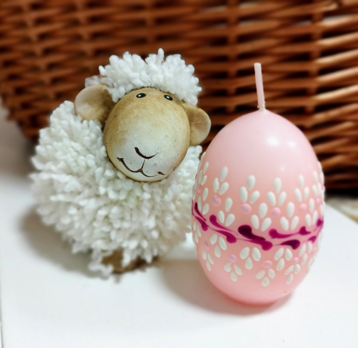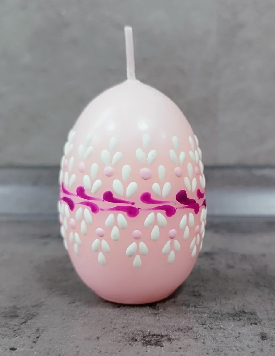Svíčka kraslice, ručně zdobená horkým voskem, stejnou metodou, jako se zdobí klasické kraslice.