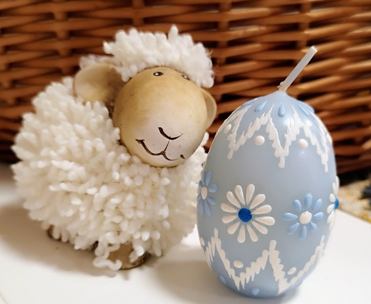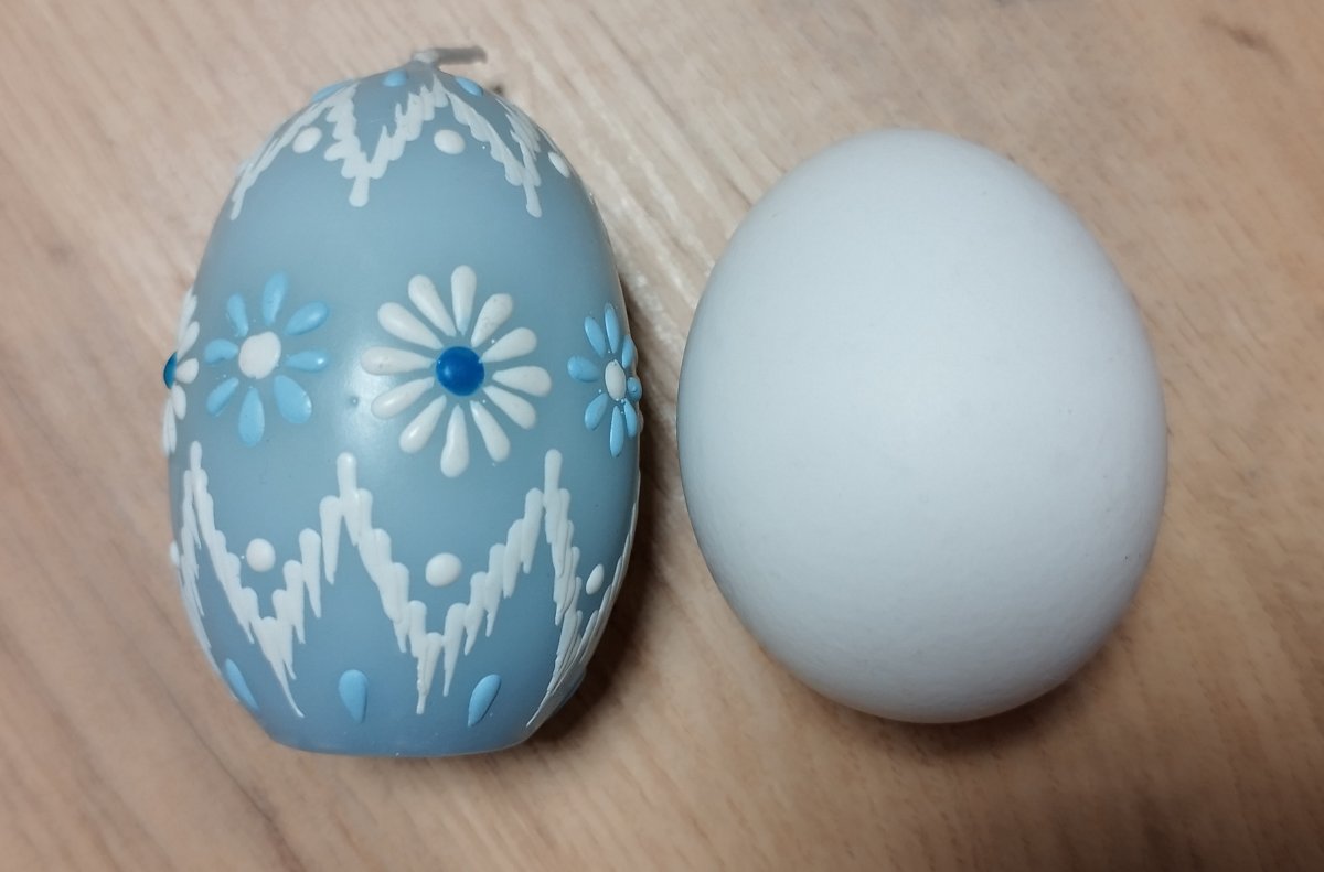 Svíčka kraslice, ručně zdobená horkým voskem, stejnou metodou, jako se zdobí klasické kraslice.