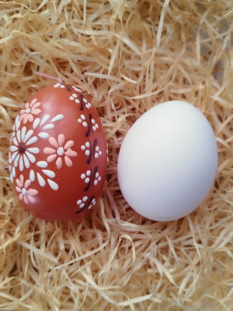 Svíčka kraslice, ručně zdobená horkým voskem, stejnou metodou, jako se zdobí klasické kraslice.
