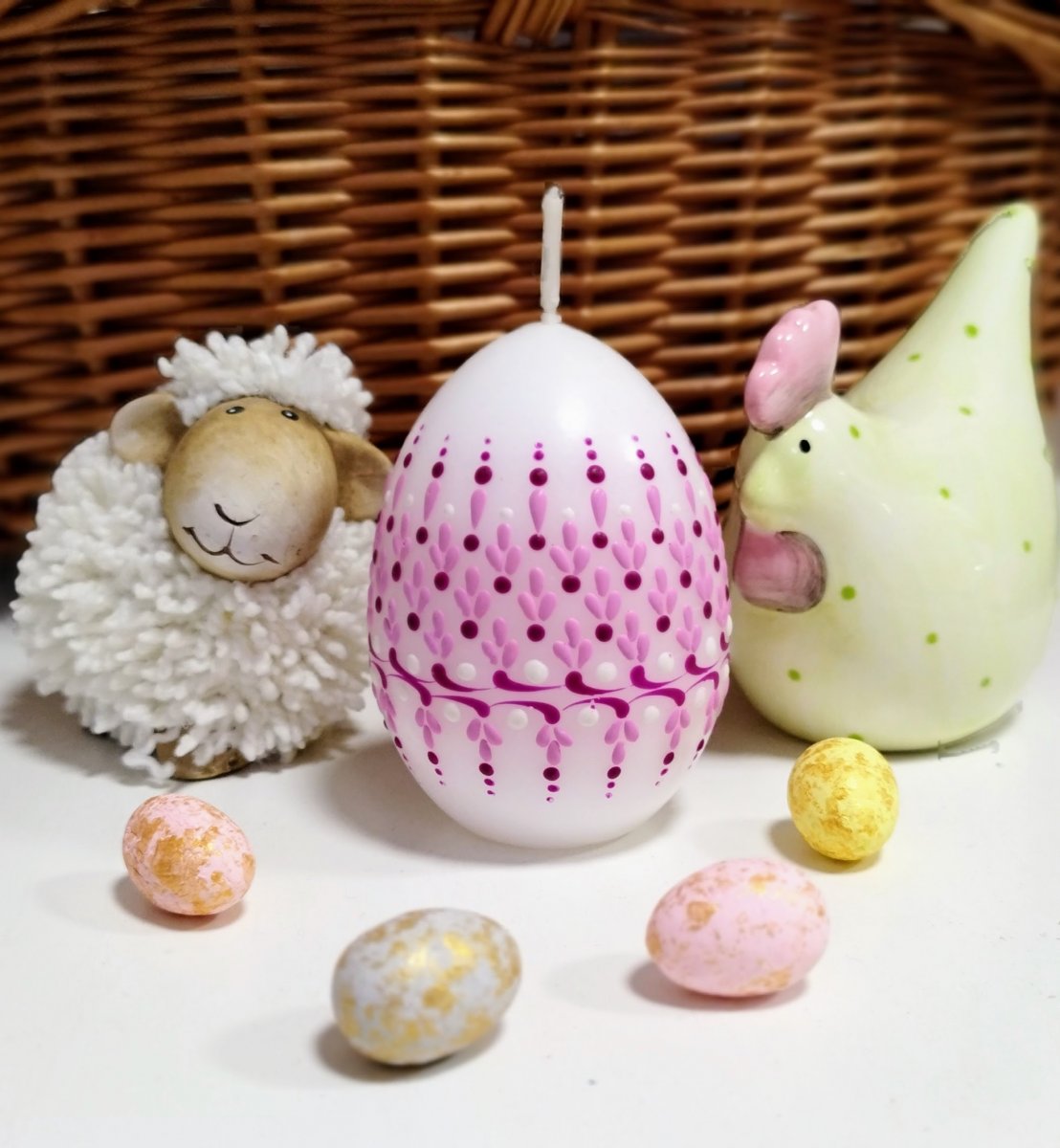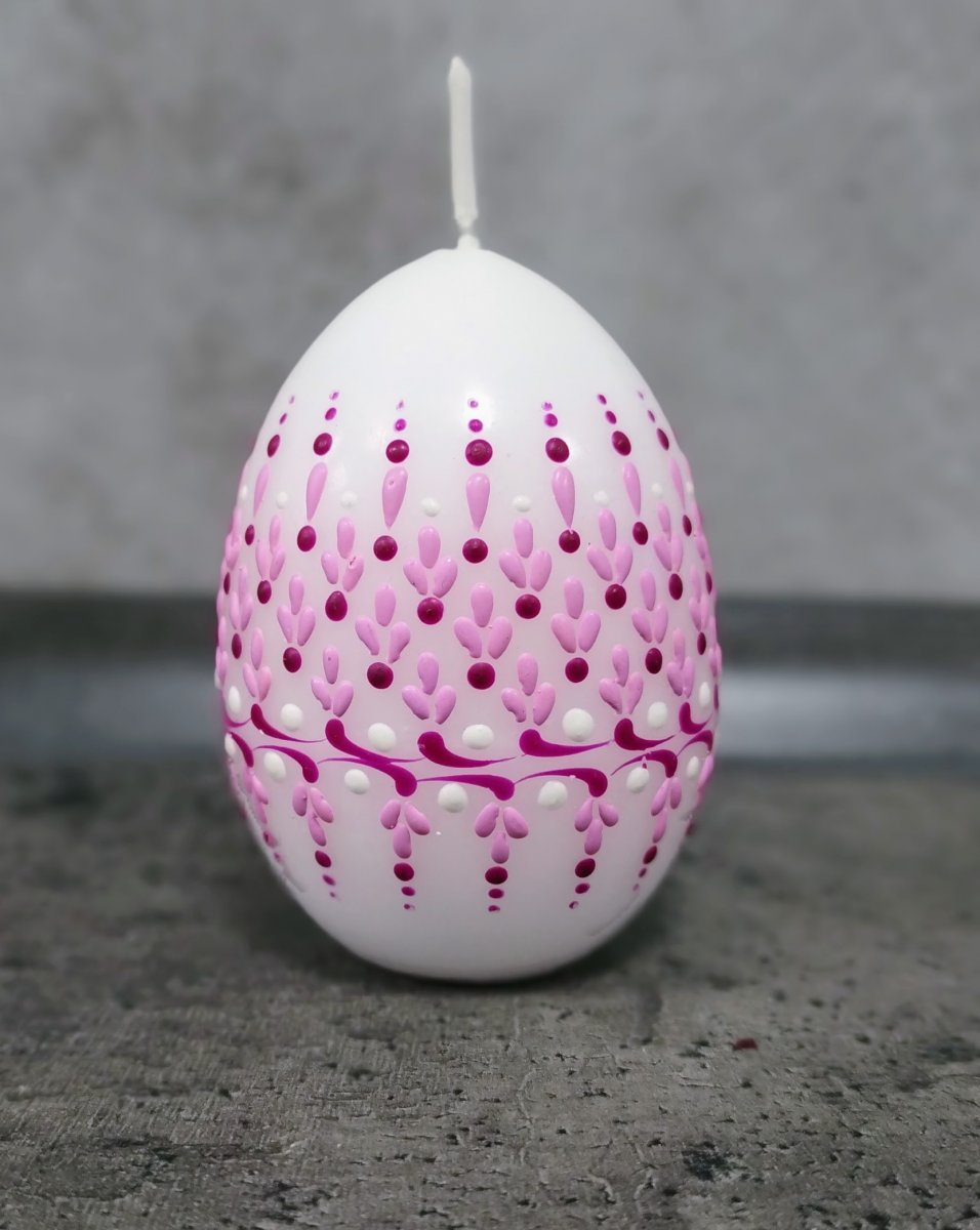 Svíčka kraslice, ručně zdobená horkým voskem, stejnou metodou, jako se zdobí klasické kraslice.