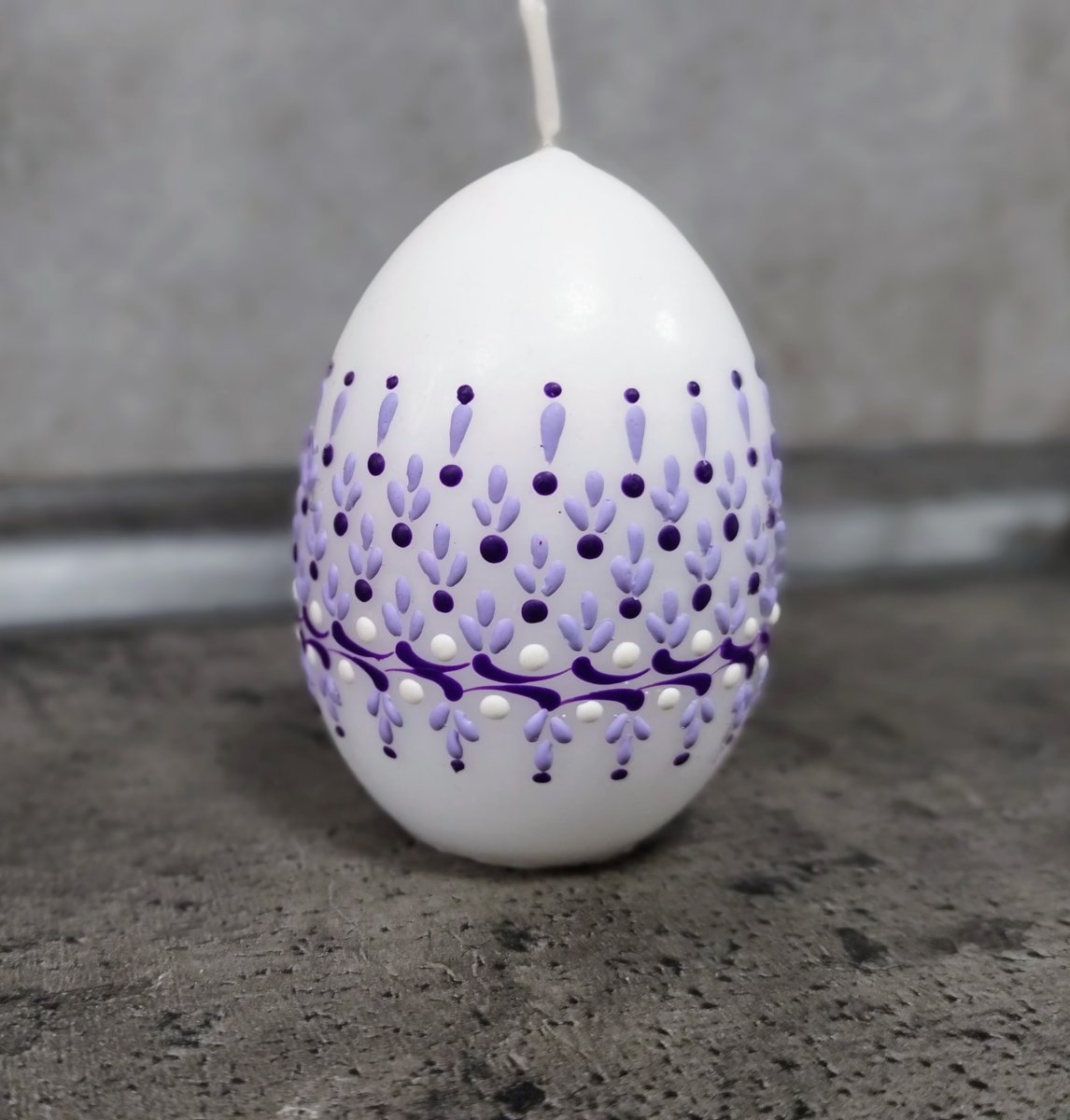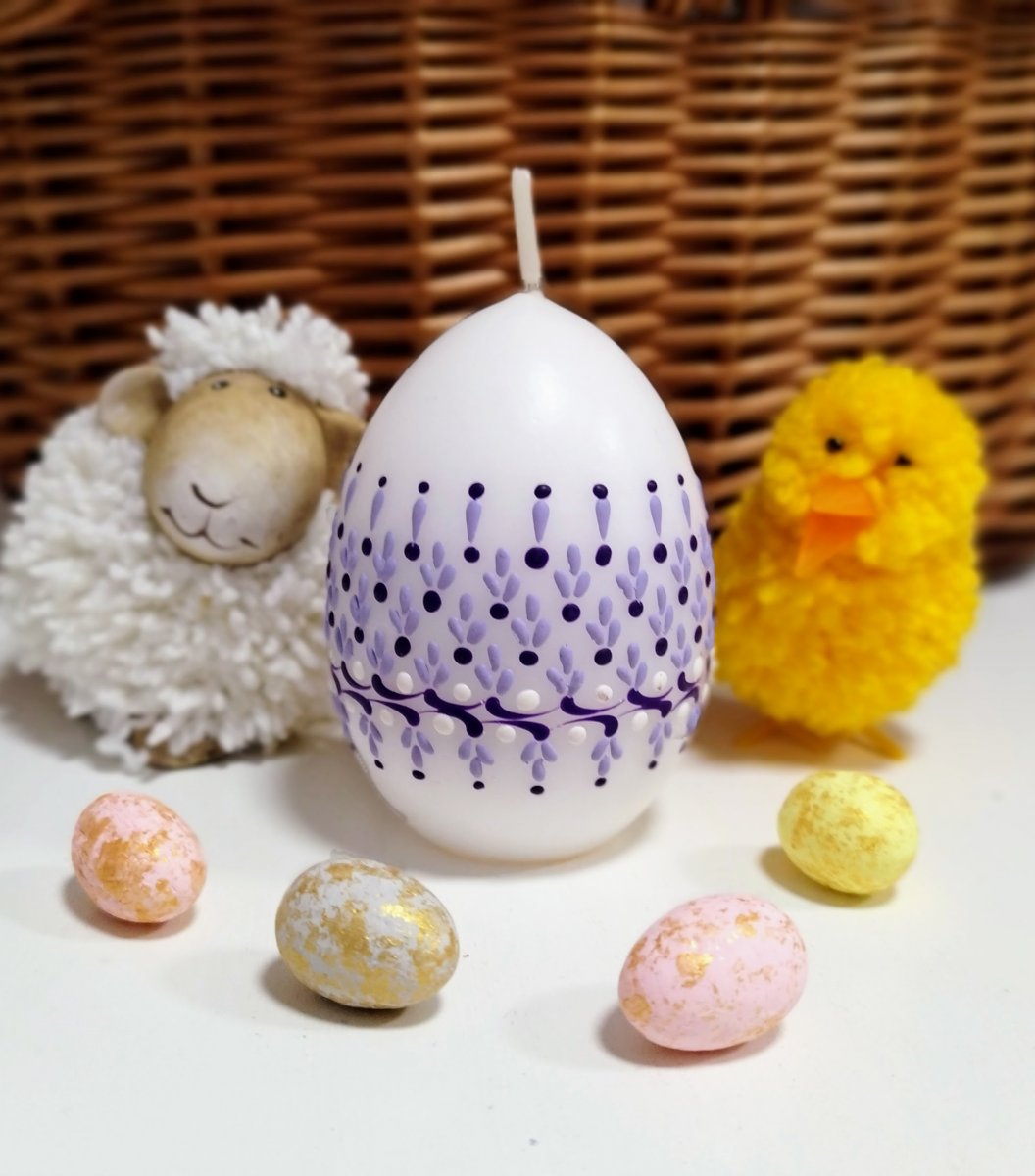 Svíčka kraslice, ručně zdobená horkým voskem, stejnou metodou, jako se zdobí klasické kraslice.