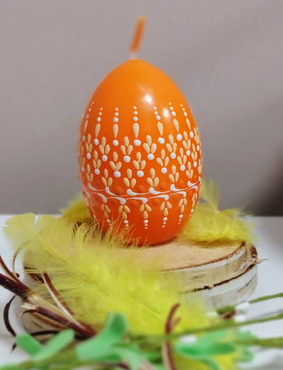 Svíčka kraslice, ručně zdobená horkým voskem, stejnou metodou, jako se zdobí klasické kraslice.