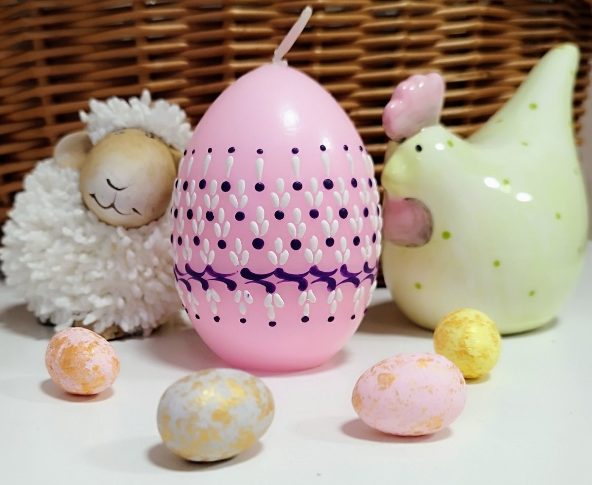 Svíčka kraslice, ručně zdobená horkým voskem, stejnou metodou, jako se zdobí klasické kraslice.