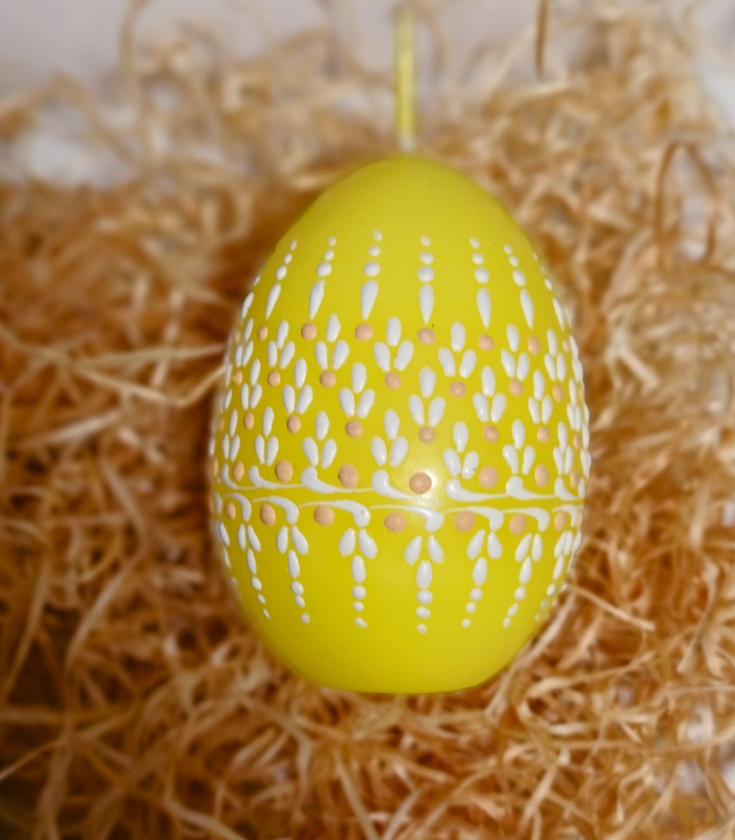 Svíčka kraslice, ručně zdobená horkým voskem, stejnou metodou, jako se zdobí klasické kraslice.