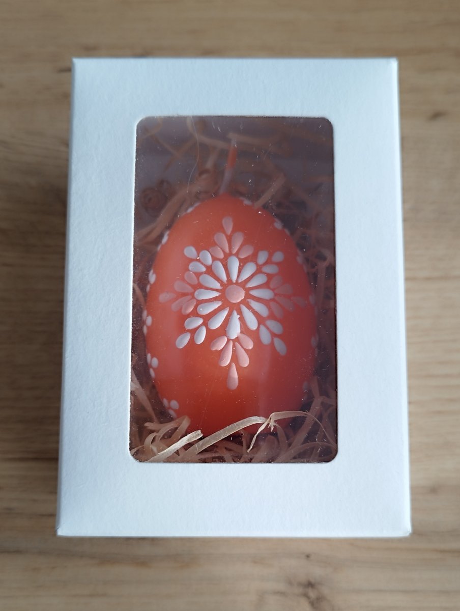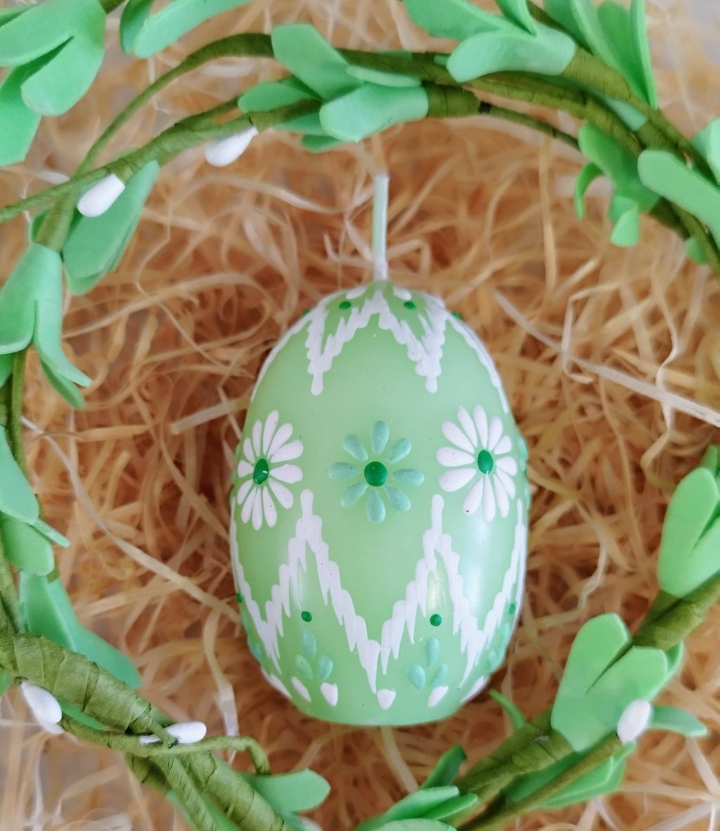 Svíčka kraslice, ručně zdobená horkým voskem, stejnou metodou, jako se zdobí klasické kraslice.