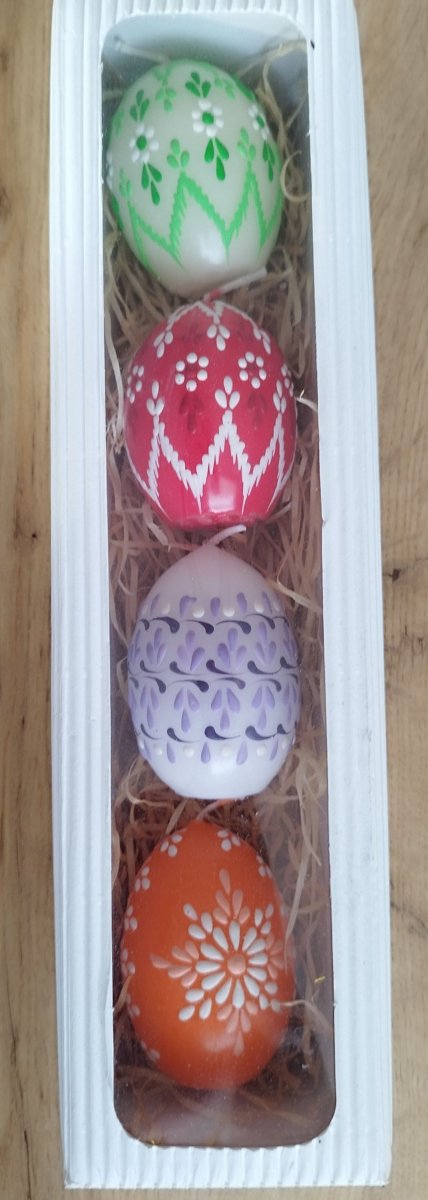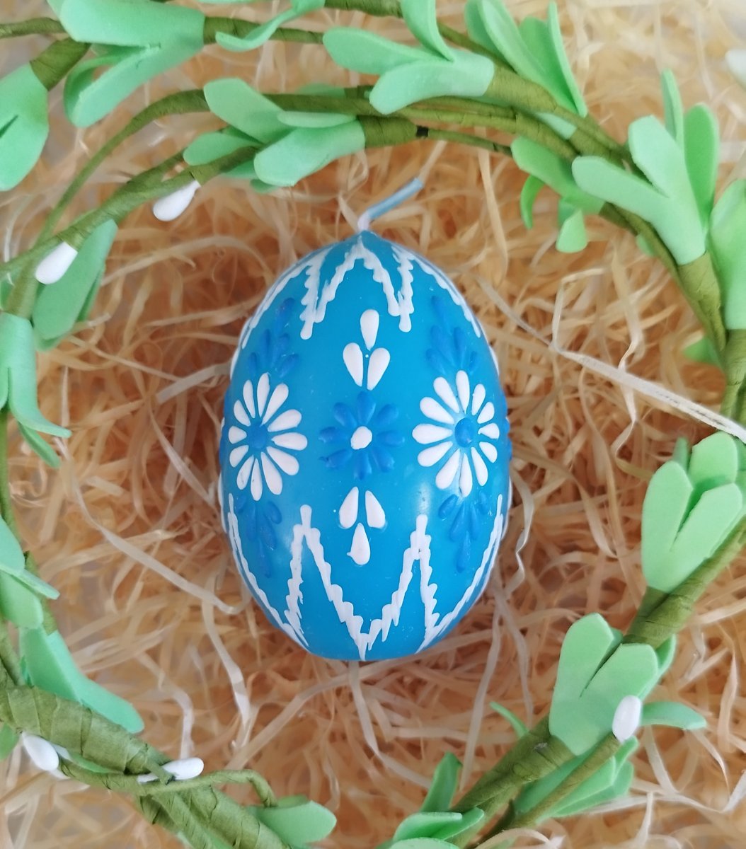 Svíčka kraslice, ručně zdobená horkým voskem, stejnou metodou, jako se zdobí klasické kraslice.