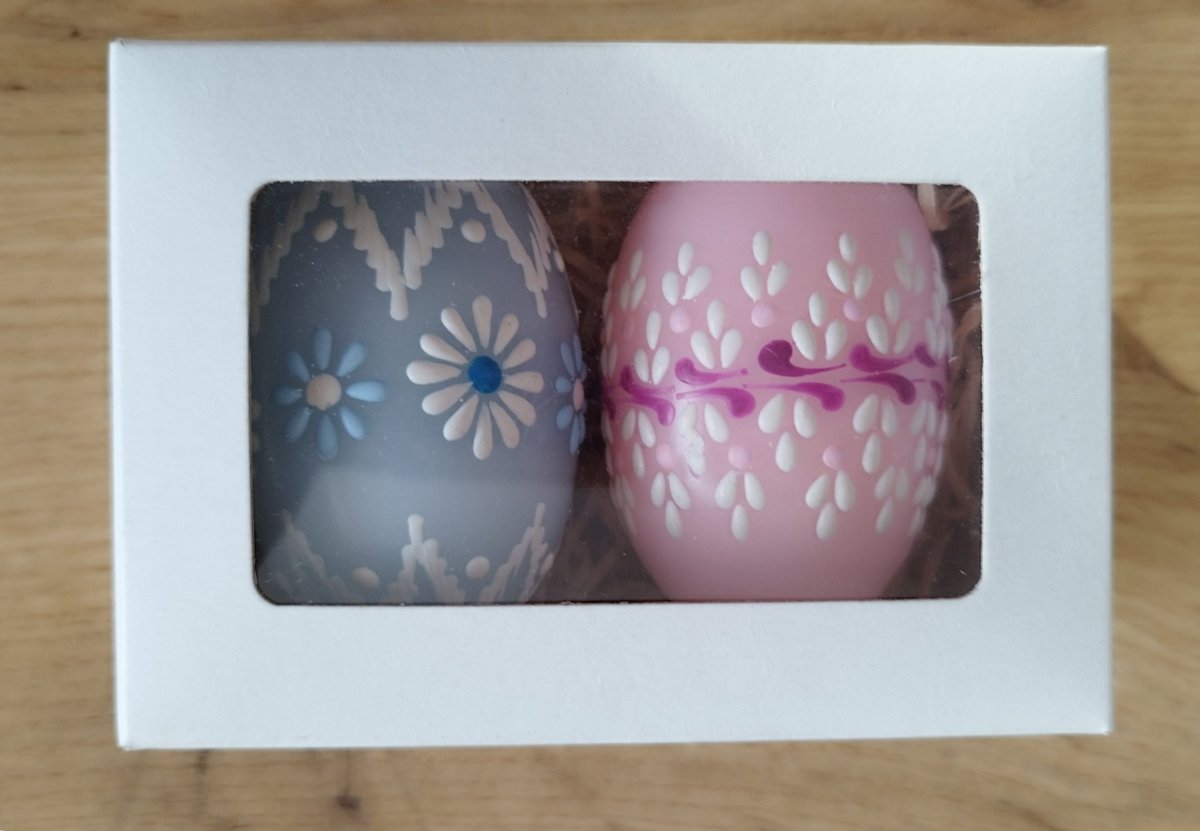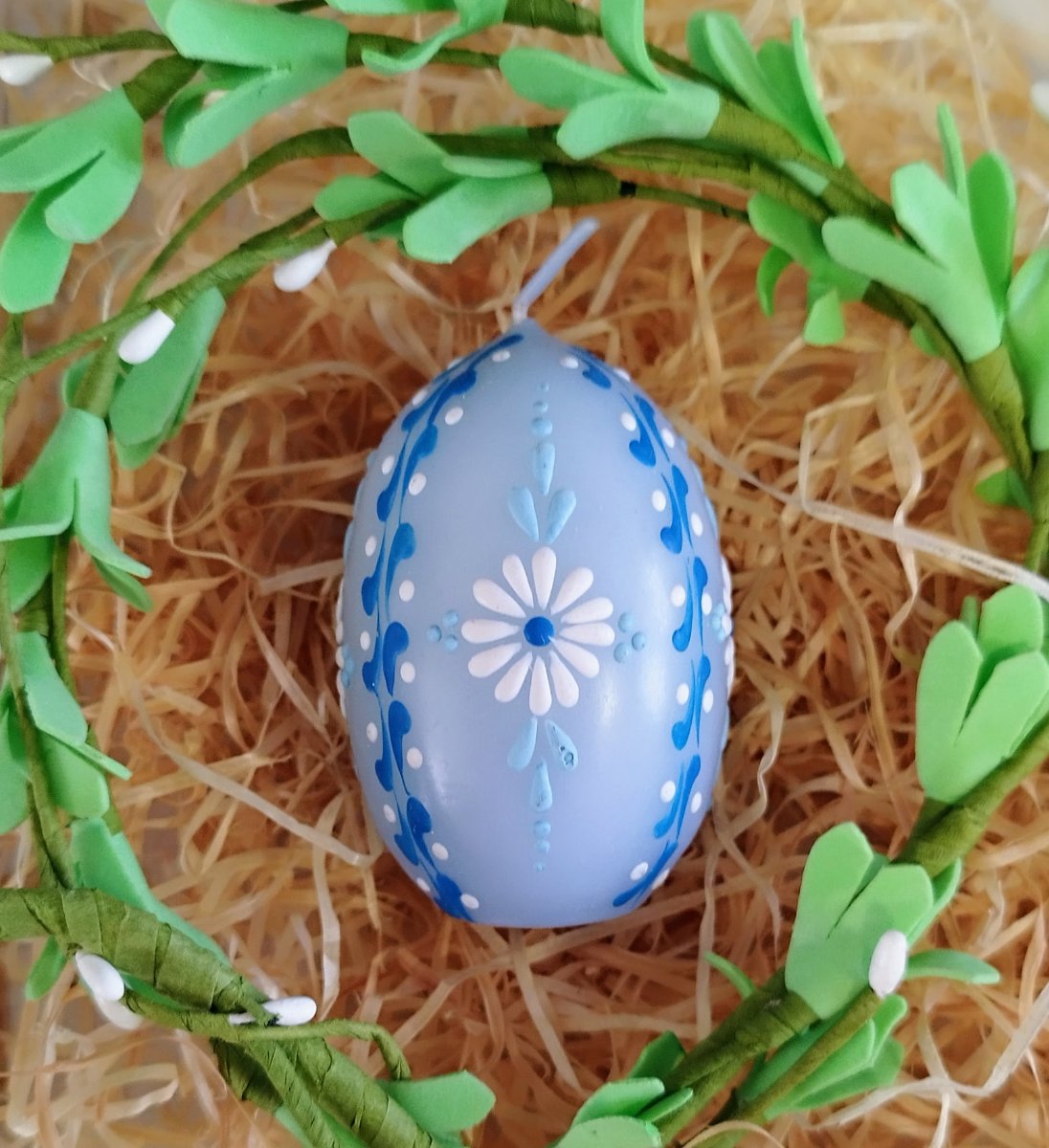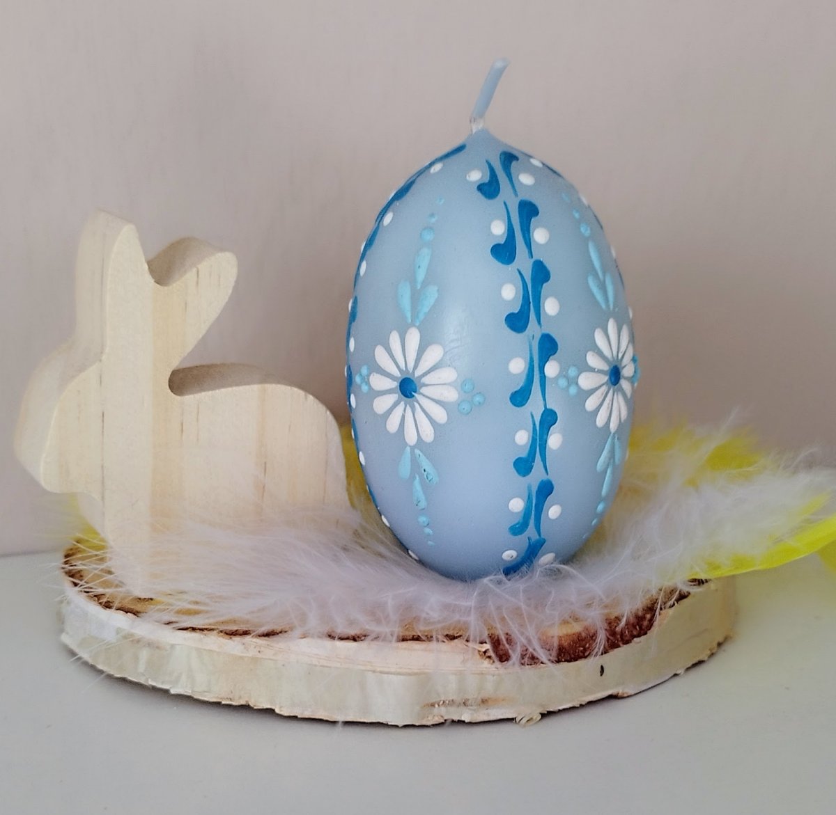 Svíčka kraslice, ručně zdobená horkým voskem, stejnou metodou, jako se zdobí klasické kraslice.