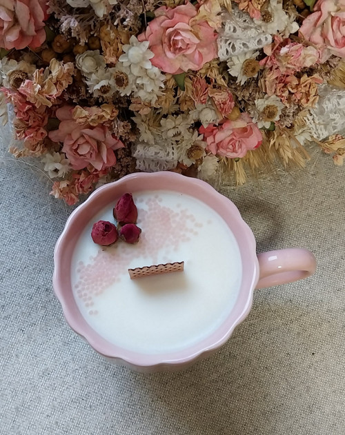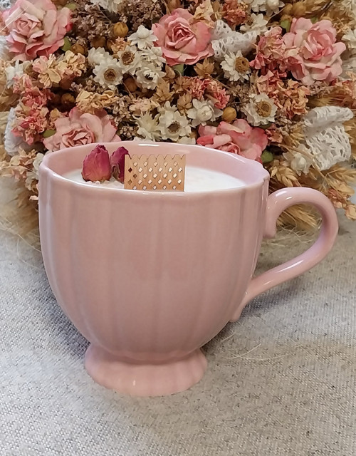 Svíčka v keramickém hrníčku, ktery jde použít po vyhoření jako hrníček na kávičku. Elegantní a krásný hrníček. Svíčka zdobená sušeným růžemi.