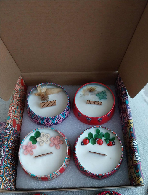 Sada svíček v hliníkovém obalu, vyrobeno pro každé roční období. Jaro voní po jarním vánku, zdobené beruškami, léto voní po ledovém vítru zdobené dřevěnými kytičkami, podzim voní po jablku/skořici zdobené sušenými květy a zima voní op white christmas zdobená dřevěným stromečkem a sušeným květem. Po vyhoření zůstanou krásné nádoby na cokoliv co Vás napadne.