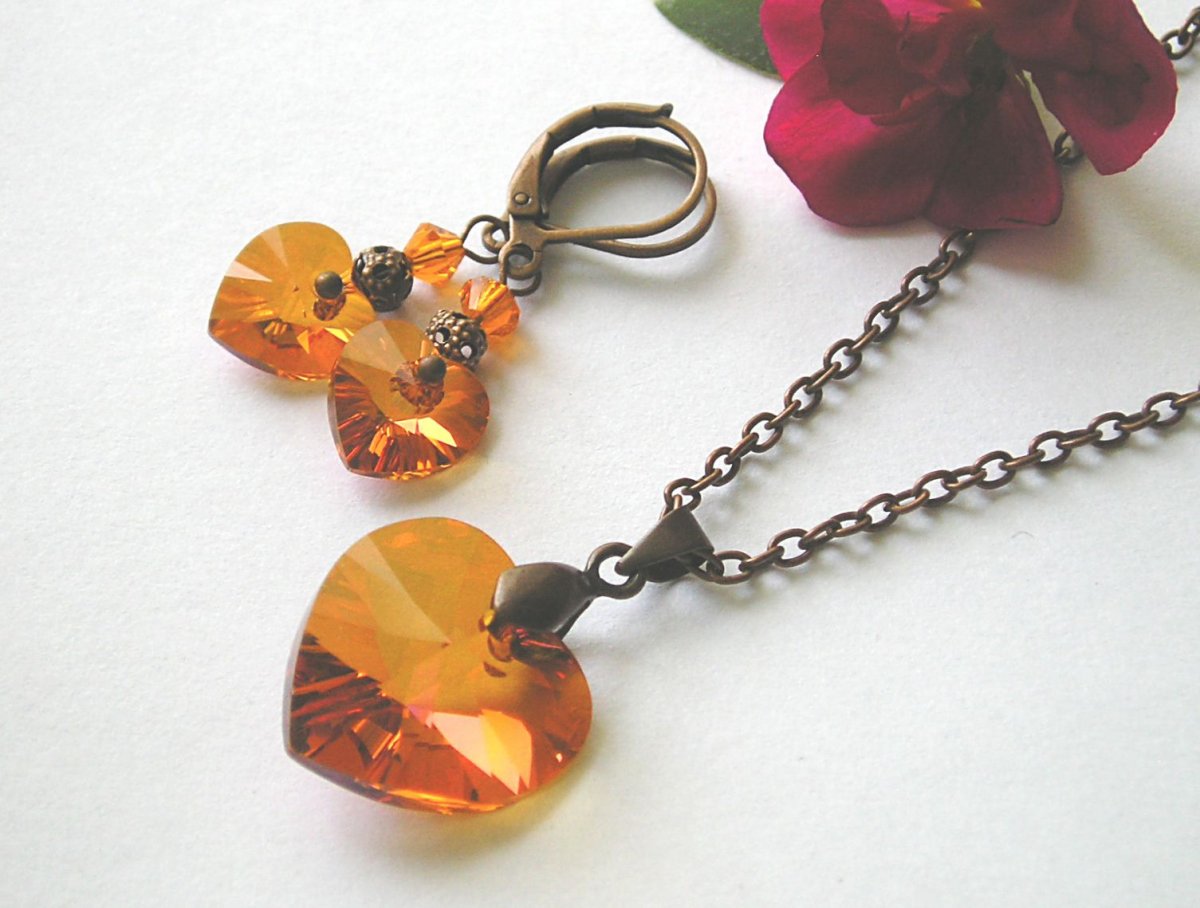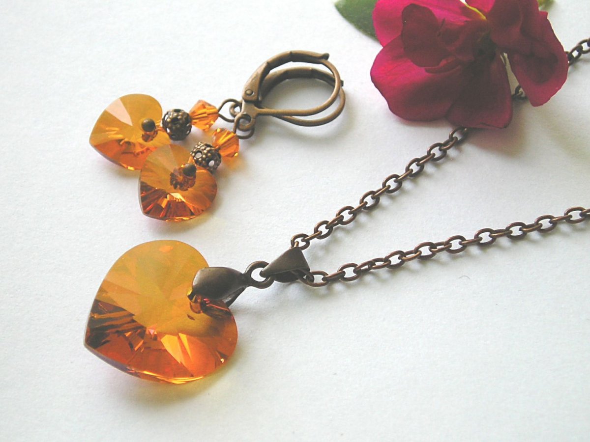 Sada je vyrobená z original crystallized swarovski ( broušený křišťál ) srdce vel. 10 mm ( náušnice ) a 18 mm ( náhrdelník ) v oranžové barvě s růžovými odlesky Astral Pink. Dále jsem použila skleněné korálky 4mm.