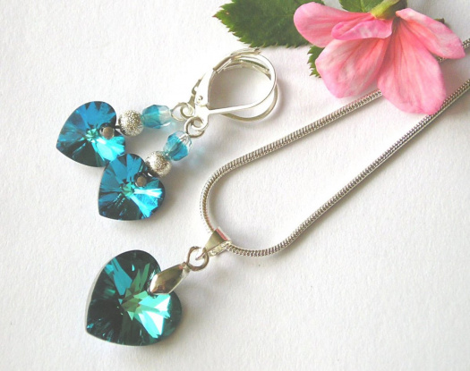 Sada je vyrobená z original crystallized swarovski ( broušený křišťál ) srdce vel. 10 mm ( náušnice ) a 14 mm ( náhrdelník ) v zajímavě tmavě modré jiskřivé barvě Bermuda Blue AB. Zadní strana srdíček je pokovena pro větší efekt odrazu světla. Dále jsem použila skleněné broušené korálky 4mm a jiskřené korálky 4 mm ve stříbrné barvě.