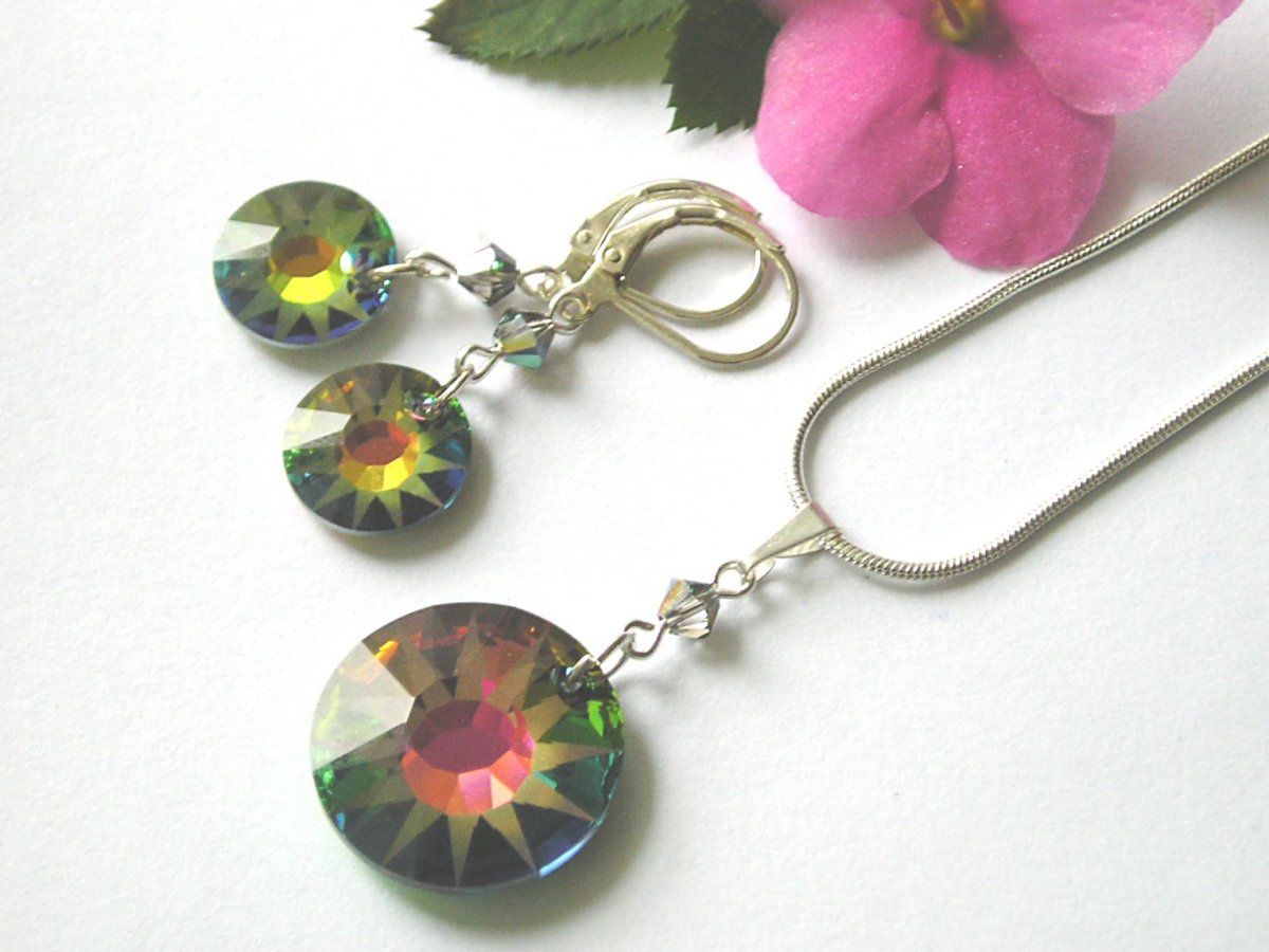Náušnice a náhrdelník jsou vyrobeny z nádherných třpytivých original crystallized Swarovski elements přívěšků kulatých sluníček vel. 12 mm ( náušnice ) a 19 mm ( náhrdelník ) v nádherně barvě Vitrail Medium ( zelený základ a různobarevné odlesky ).
