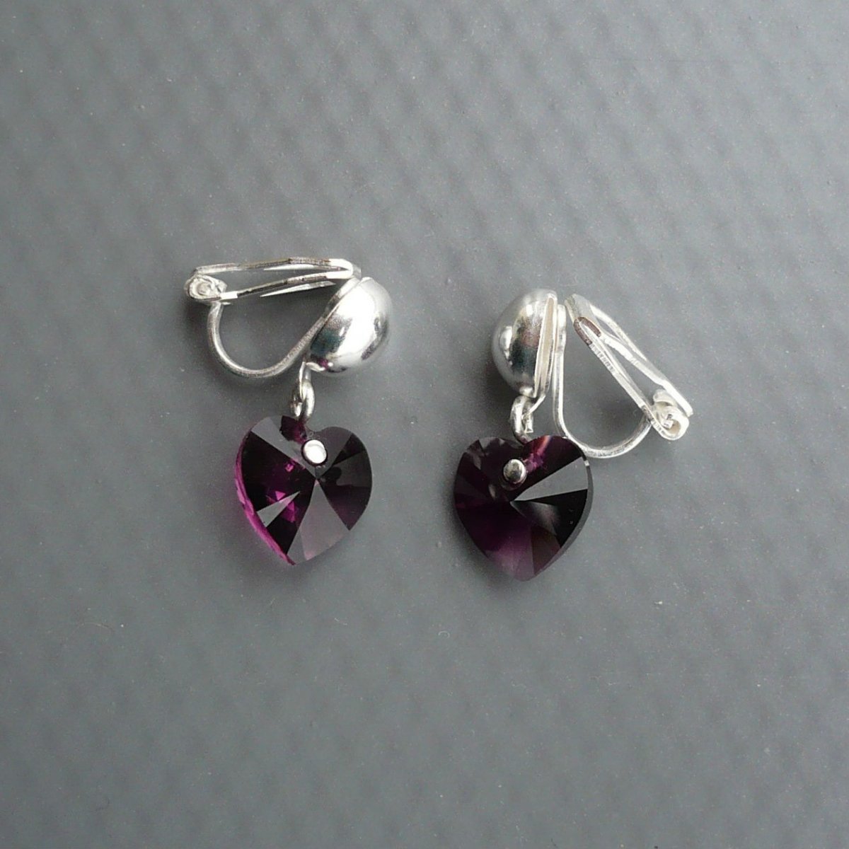 Na klipsové zapínání stříbrné barvy je zavěšeno tmavě fialové Swarovski srdíčko.