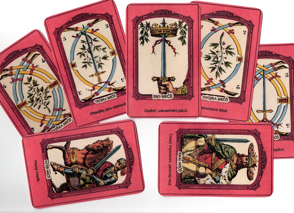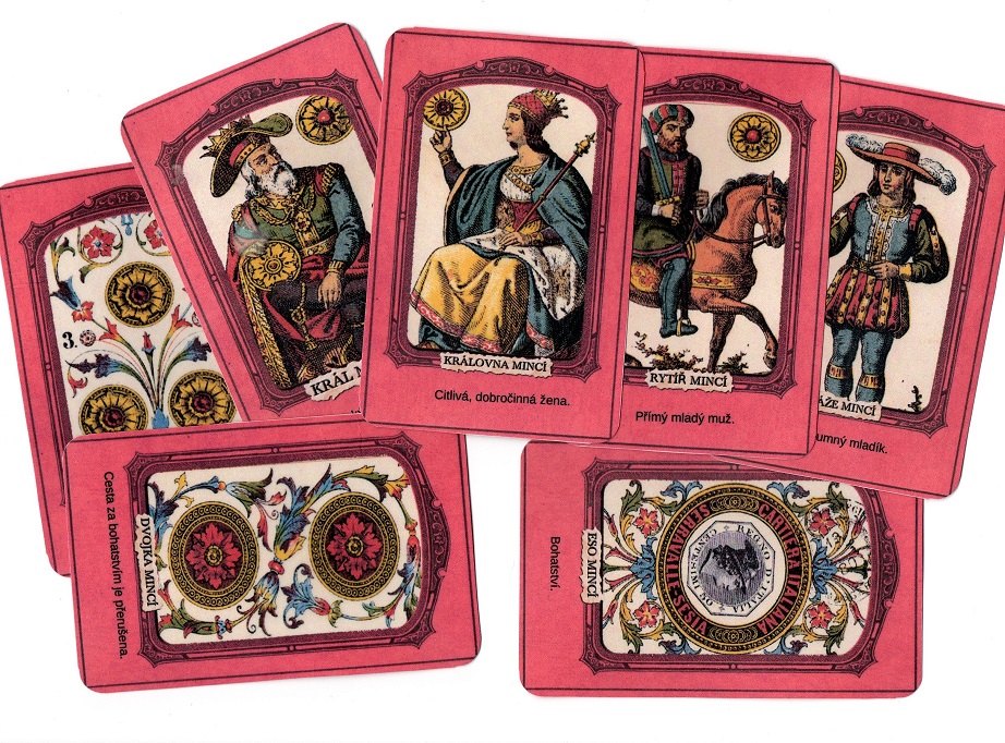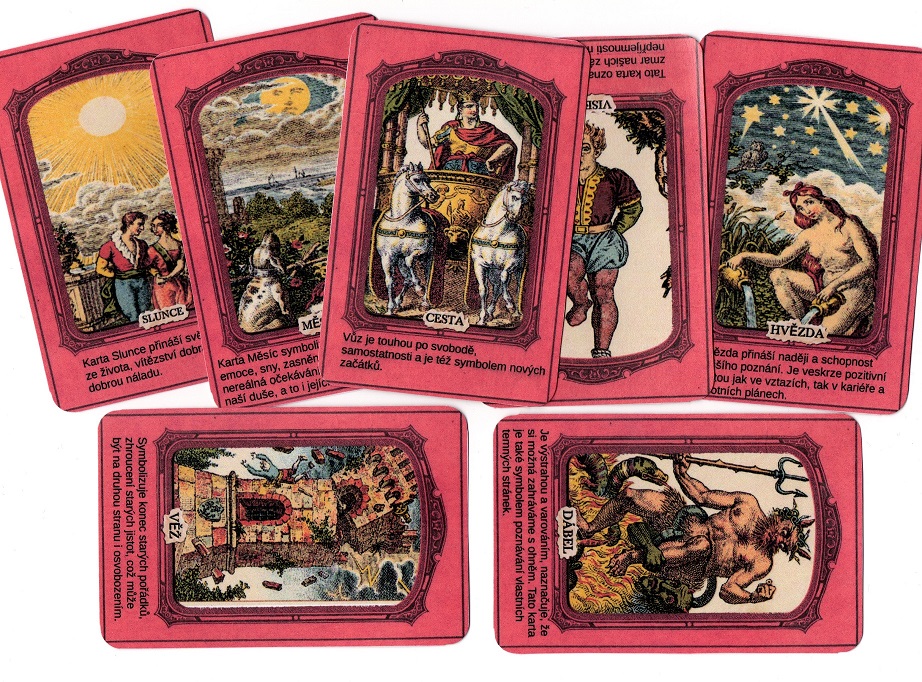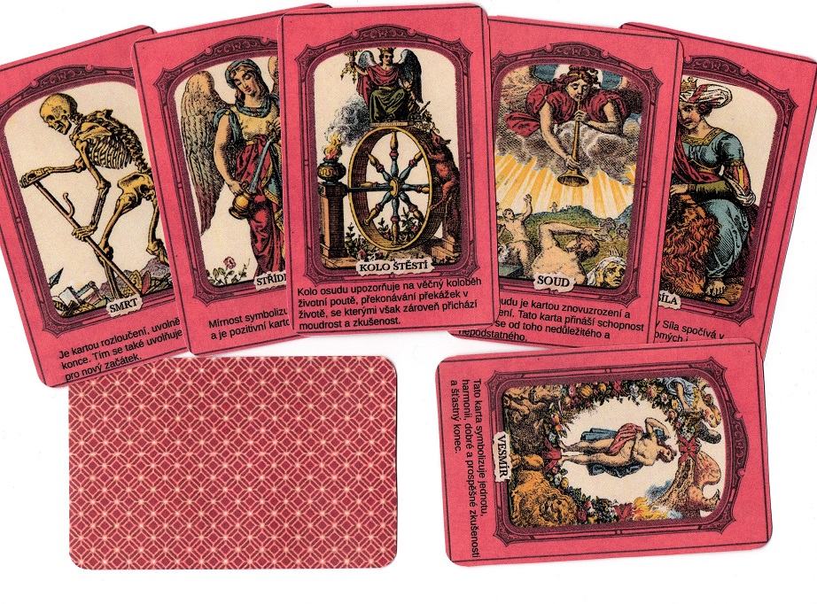 Tarot MALÁ +VELKÁ arkána s popisem významu vel 11,4x7,4 na papíře 250g , použité obrázky starý Italský tarot z 19 století , 78 kusů ,přelakováno pro pevnost a proti oděru.
