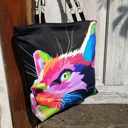 taška ušitá z imitace koženky v černé barvě a bavlněného panelu s motivem kočky