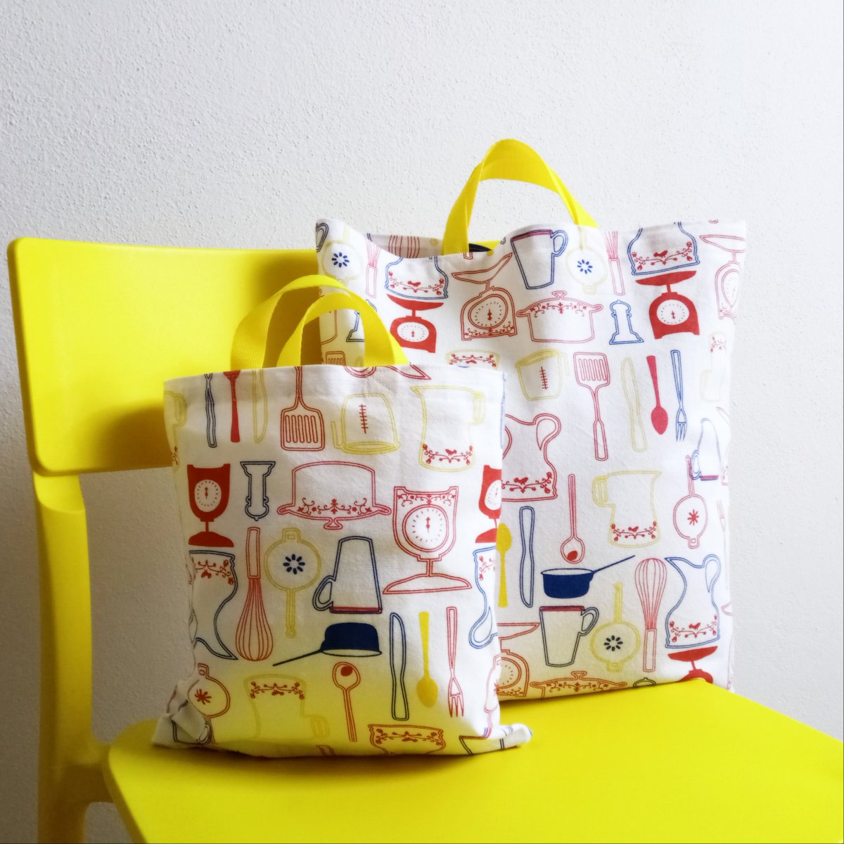 plátěnka, plátěná, taška, nákupka, na nákup, skladná, skladnost, látková, látková taška, taška s krátkými uchy, veselá taška, kuchyň, nádobí, vidlička, hrnec, konvička, žlutá, červená, bílá, barevná taška, bílá taška, kuchyň, bavlna, bavlněná taška